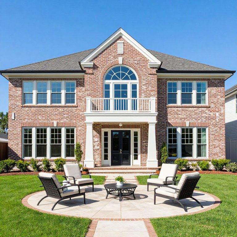 Photograph of a two-story brick house with a gabled roof, featuring white-framed windows, and a central arched window above the front door. The house has a symmetrical design with two large windows on each side. In the foreground, there is a circular concrete patio with four black metal and white cushioned chairs arranged in a circle around a black metal fire pit. The patio is surrounded by a well-maintained green lawn with small shrubs and potted plants. The bright blue sky is clear, indicating a sunny day.