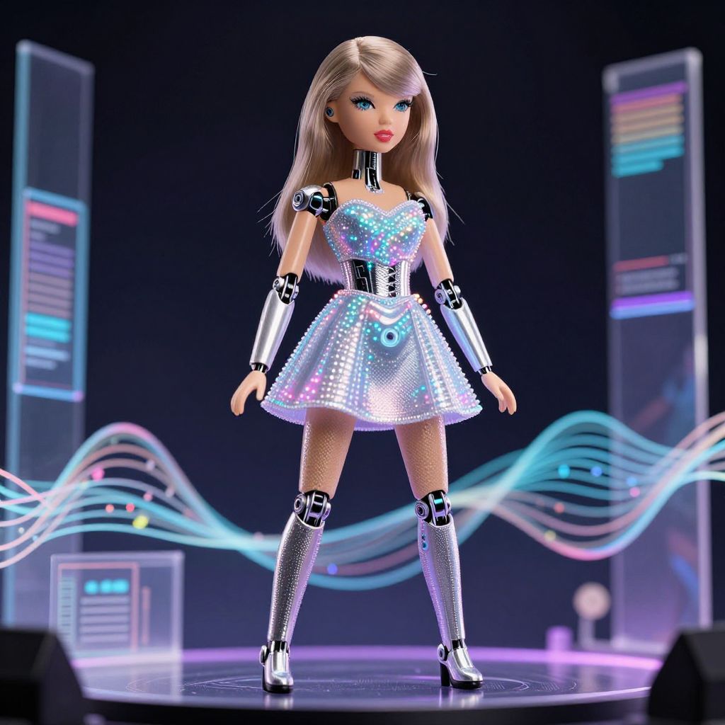 Taylor swift toy, a futuristic robot doll with elegant feminine design, inspired by a popular singer, LED lights on the dress, sleek metallic textures, standing on a stage with holographic visuals and musical waves, cyberpunk aesthetic