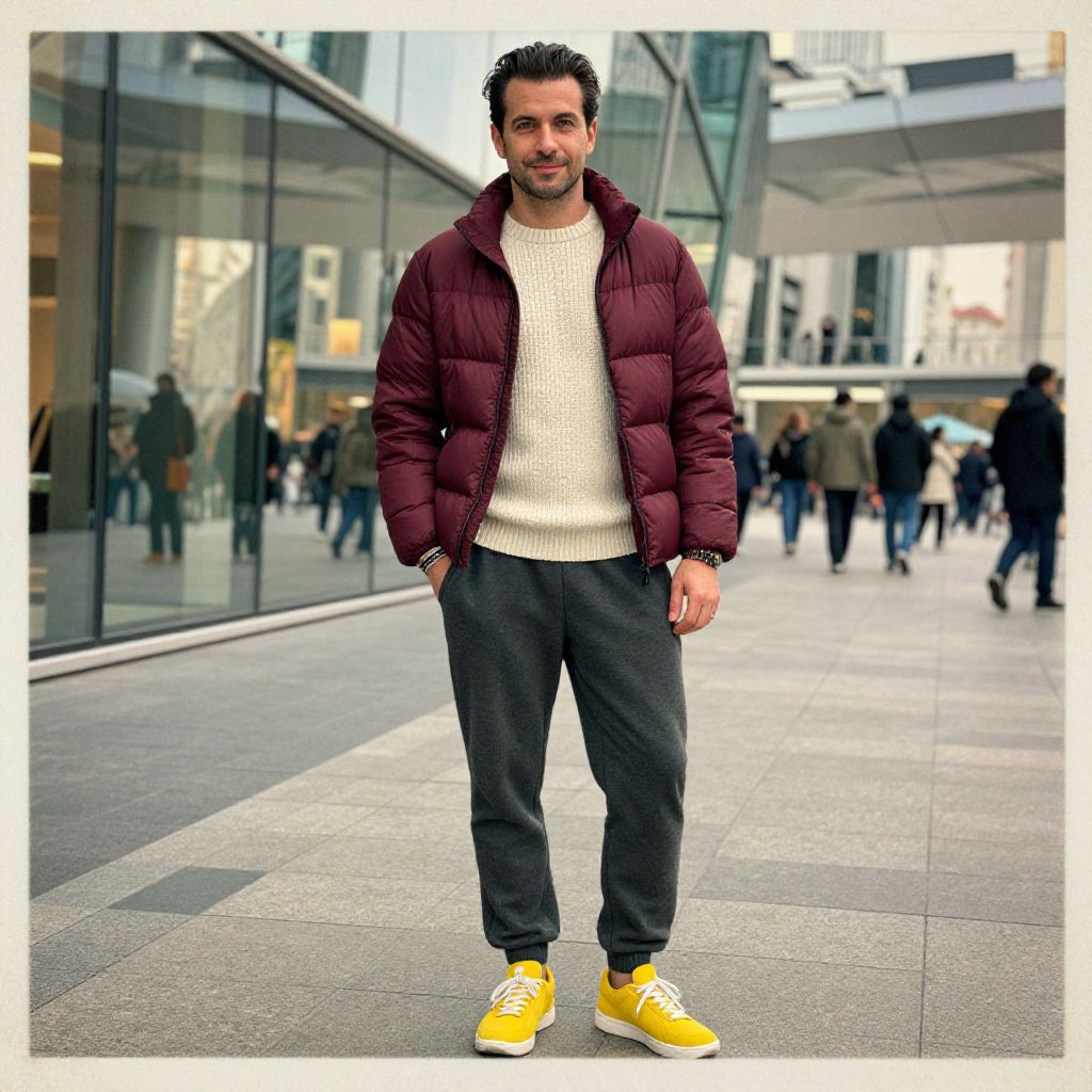 A man, burgundy puffer jacket, cream knit sweater, charcoal grey sweatpants, vibrant yellow sneakers, layered bracelets, modern glass structure, reflective surfaces, bustling plaza, vintage photo style, relaxed smile. Man has masculine face and piercing eyes