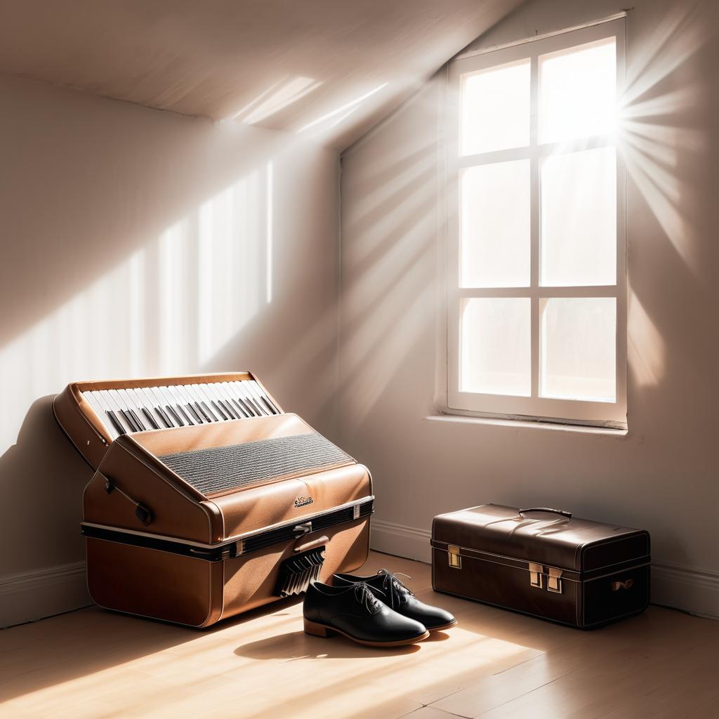 Minimalist Fashion hyperrealistic photo of dusty attic, light streaming in from the right, with an accordion lying on its side, a ukelele leaning against a trunk, and a pair of dancing shoes on the floor, all lightly covered with dust,