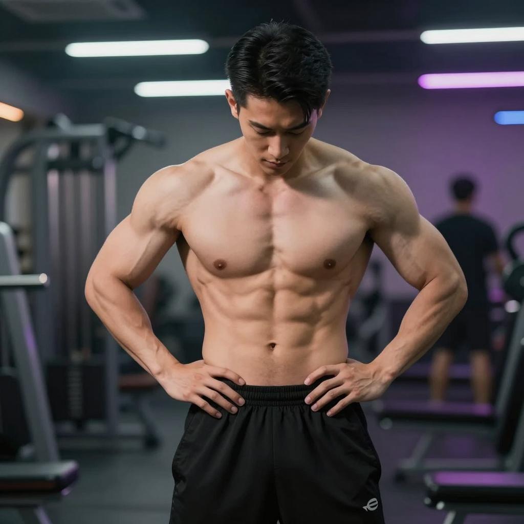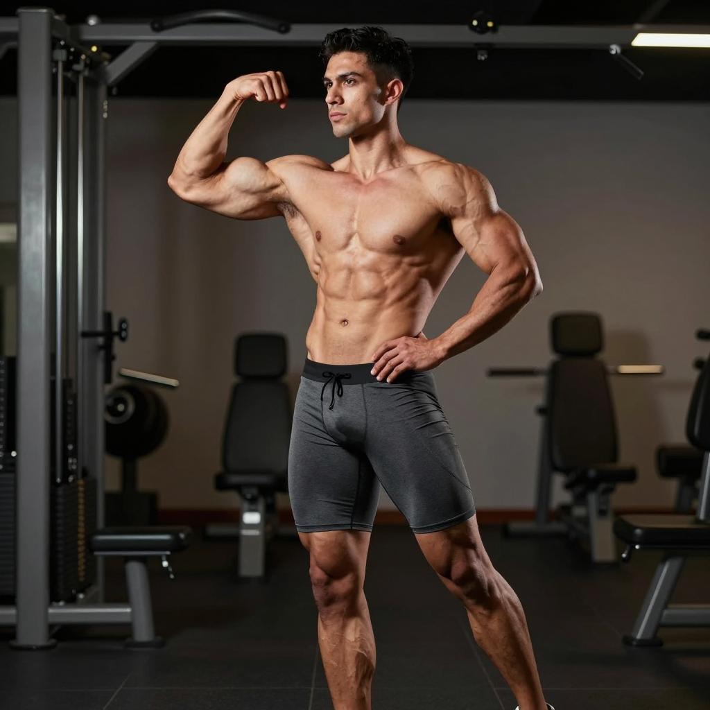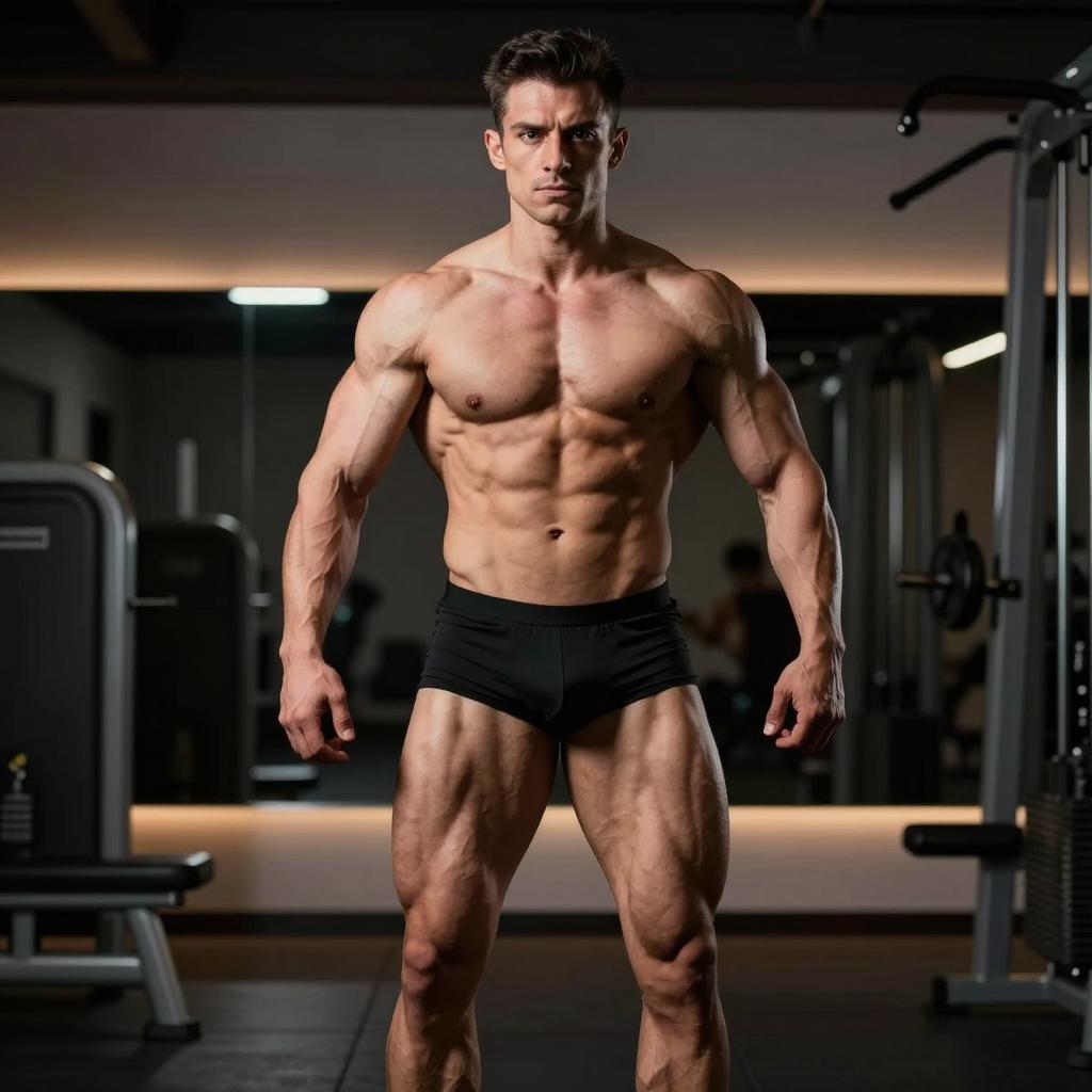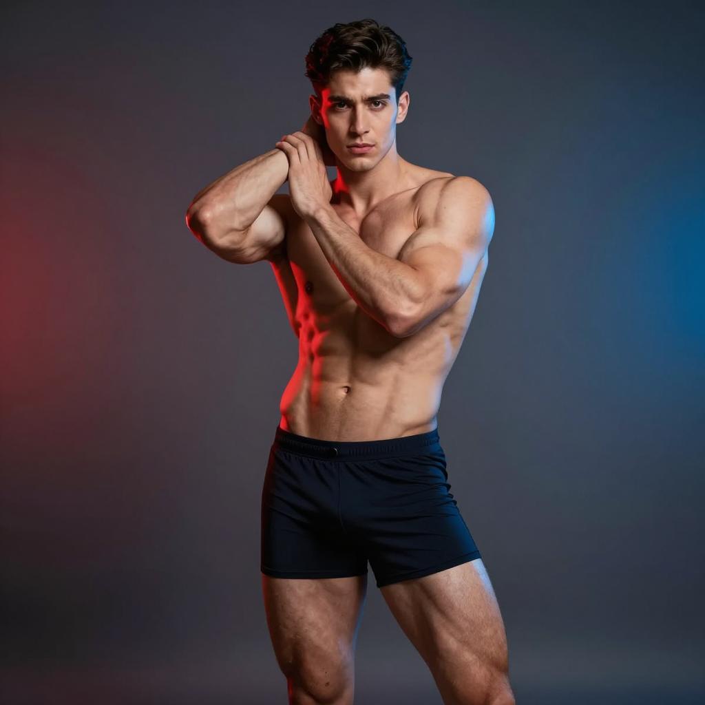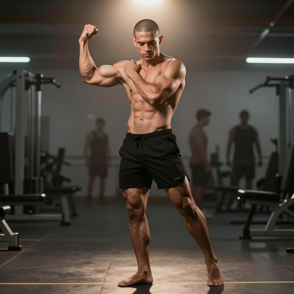 Full body portrait of fit man with sixpack abs, powerlifter-style man with wide shoulders and close-cut hair wearing plain dark sports shorts hugging the thighs posed front double-biceps pose with elbows wide in cinematic gym-inspired environment with hazy silhouettes under club-style lighting with saturated gels and clear definition on abs, ultra-detailed bodybuilding photography, 8k, sharp focus