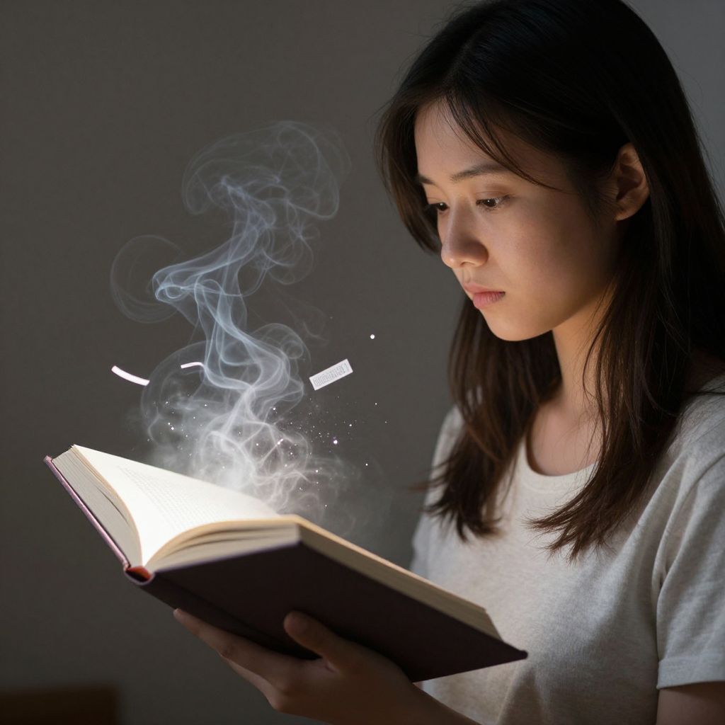 A young woman engrossed in reading holds an open book, its pages illuminated by soft light as ethereal wisps of smoke rise and swirl around her, transforming the words into fleeting, dreamlike memories.