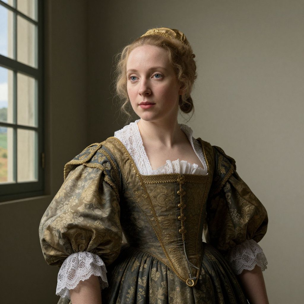 A digital artwork reminiscent of Jan Steen's style, featuring a woman in period attire with voluminous sleeves and a lace-trimmed bodice, set against a serene backdrop with a window view of a pastoral landscape, rendered in high-definition detail with naturalistic lighting.