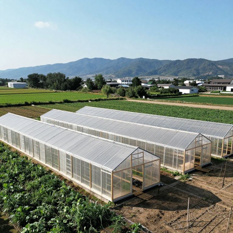 "Chalk Fifty large wooden frame greenhouses stand side by side in a rural setting. The time is noon and the sun is shining brightly. Mountains can be seen in the distance. Wide angle. Taken by drone.,"
