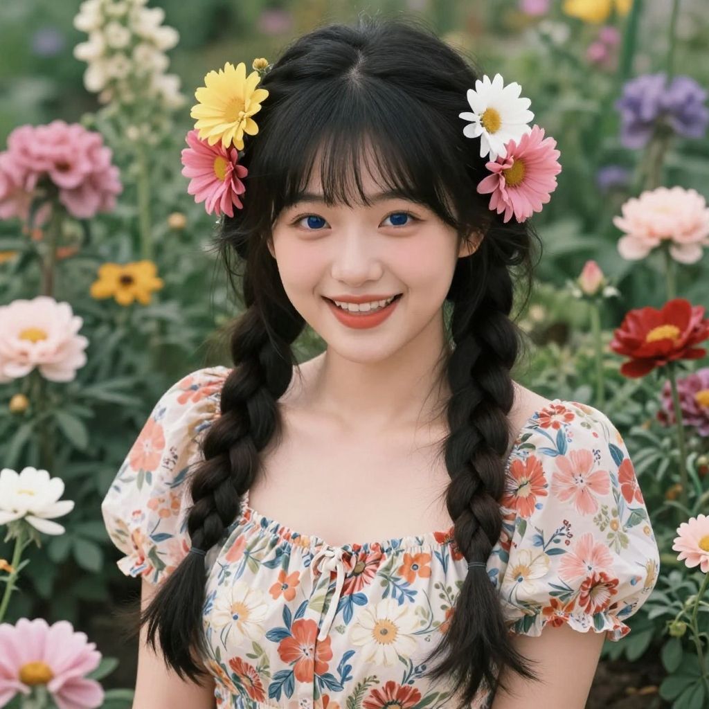 Photograph of an East Asian woman with long, black, twin braided hair standing in front of a lush green bush with pink and white flowers. She has fair skin, large brown eyes, and a slightly surprised expression. She is wearing a sleeveless, lavender dress with a gathered neckline. The background is filled with vibrant green leaves and delicate flowers, creating a natural, serene setting. She has a simple necklace with a small pendant. The lighting is bright, highlighting her features and the colors in the background.