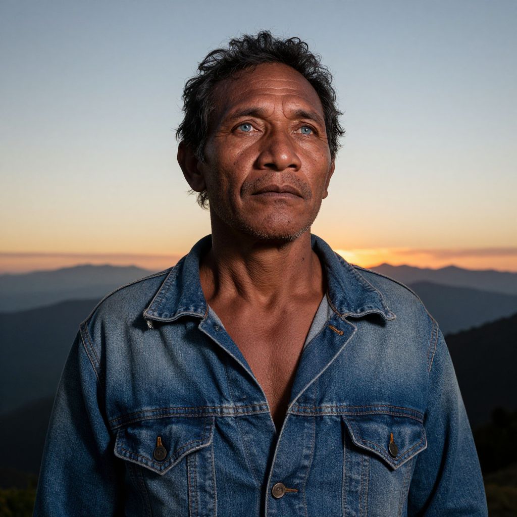 A super-realistic portrait captures a weathered Melanesian man with gentle blue eyes and a rugged complexion, his strength and resilience emphasized by the low-angle perspective. His gaze exudes wisdom mixed with melancholy, set against a serene mountain landscape bathed in the warm glow of sunset, subtly illuminating creases and scars earned through life's trials. Wearing a simple, well-worn denim jacket, he stands in silhouette, embodying an emotional depth that speaks volumes without words as the horizon stretches endlessly behind him.