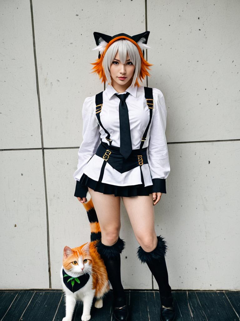 Photo-realistic cosplay photo of person in mousse (arknights) costume. Full body. Standing. Full length. 1girl, cat girl, cat ears, cat tail, animal ear fluff, two tails, green eyes, white hair, short hair, blonde hair, orange hair, two-tone hair, brown hair, multicolored hair, white shirt, black headwear, mini hat, collared shirt, long sleeves, black necktie
