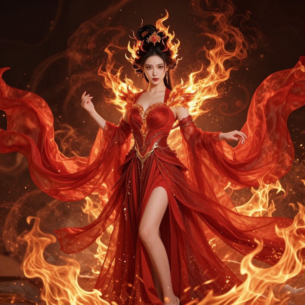 A woman dressed in an elaborate red gown stands poised amid swirling flames that flow around her, with fiery elements integrated into her hair and outfit. The image features a vibrant fantasy style with dynamic lighting and dramatic, flowing fabric, emphasizing a powerful and mystical presence.