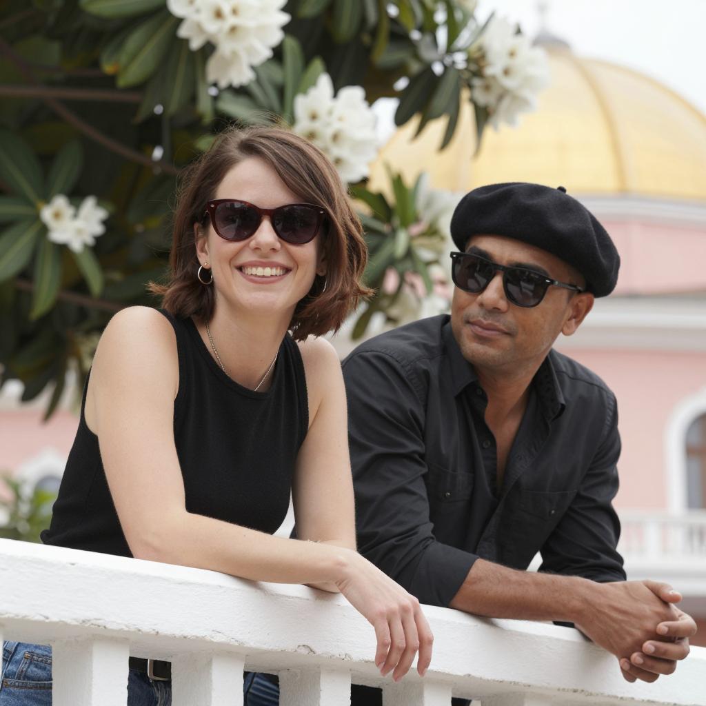 Two people leaning on a white railing. The woman with short brown hair, wearing a black sleeveless top and dark sunglasses, smiles brightly. The man with a black beret, black shirt, and dark sunglasses stands beside her, looking slightly to the side. Green leaves and white flowers are in the background, with a pink building and a yellow domed roof visible. Both have their arms on the railing, with the woman's arm resting on top. The man is on the right, the woman on the left.