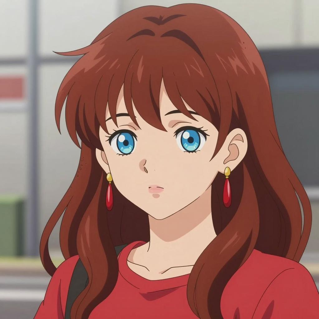 A digital portrait of a young woman with striking blue eyes and long reddish hair, wearing a red top and matching earrings. The artwork features a soft, detailed anime-inspired style with a blurred urban background enhancing the focus on her expressive face.