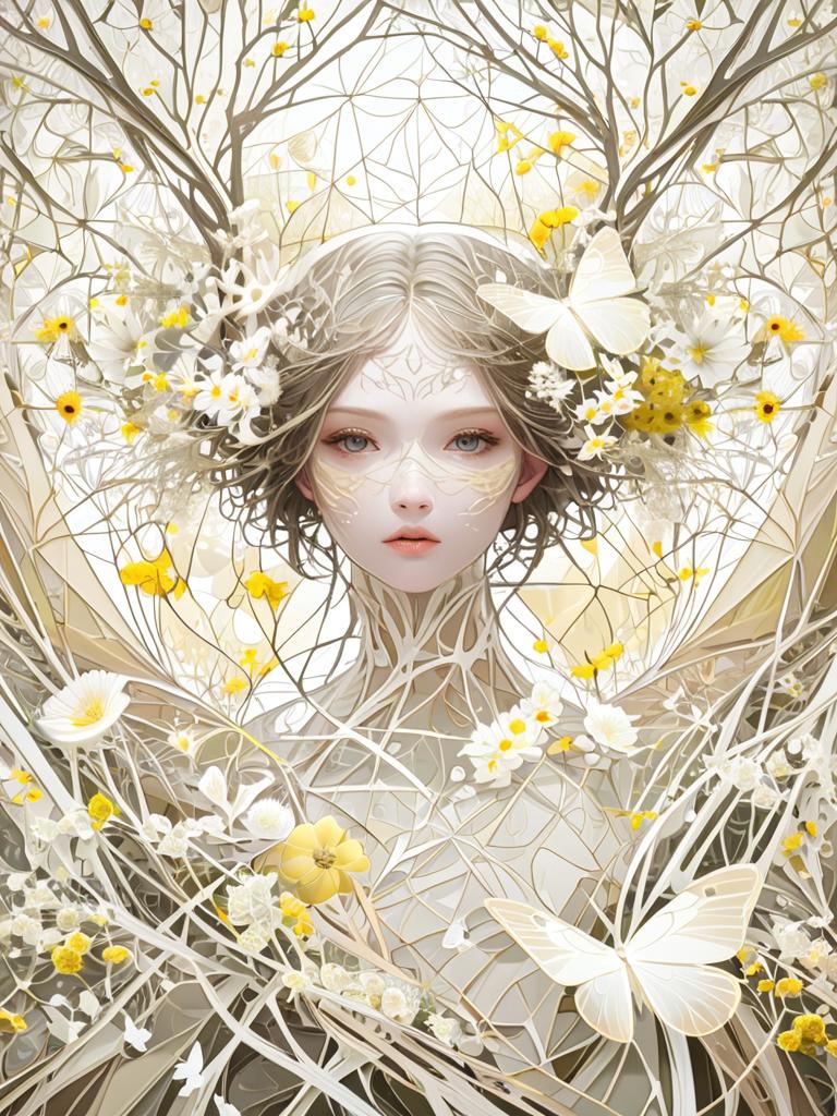 A surreal fantasy portrait of a woman intertwined with delicate branches, yellow and white flowers, and ethereal white butterflies. The image features soft muted earth tones with intricate abstract geometric shapes blending seamlessly into natural forms, creating a serene and mystical atmosphere. The woman's face is detailed with flowing organic lines and subtle, elegant patterns, enhancing the dreamlike quality of the artwork.