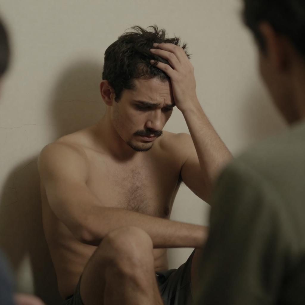 Man covered in thick brown mud kneels in a muddy, circular pit. He looks into a curved mirror on the right. Mirror reflects his muddy face and upper body. Background: white, cracked walls with mud splatters. Mirror's edge has mud. Reflection shows intense expression. Mud covers man's entire body. Dim, dirty setting. Man's skin tone is obscured by mud.