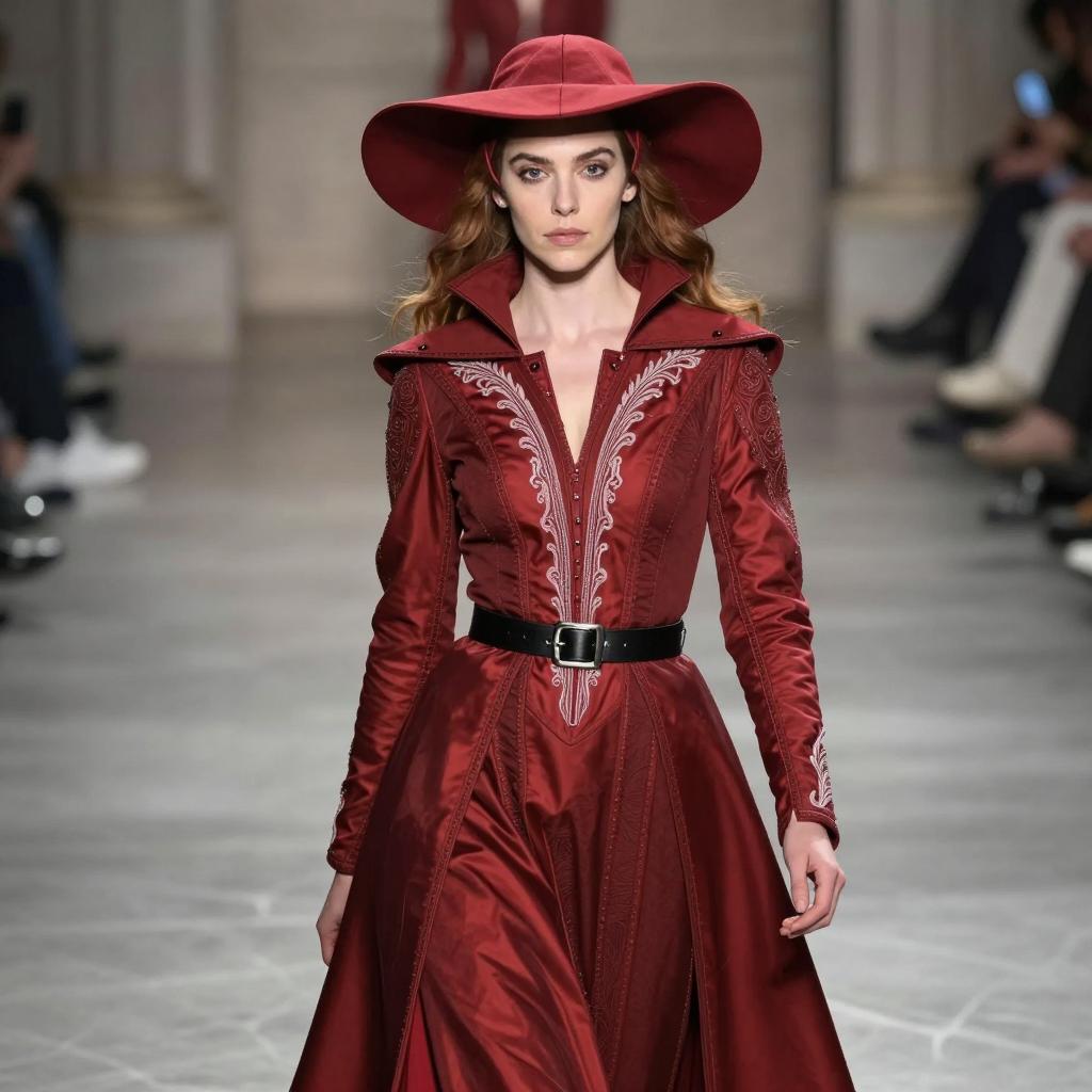 Scarlet witch clothes, photorealistic, digital art, fashion runway, woman, standing, full body, red satin medieval-style dress, high collar, intricate white embroidery, deep V-neck, black belt with silver buckle, red wide-brimmed hat, brown wavy hair, serious expression, blurred background, gray runway, soft lighting, realistic ures, historical costume, elegant, detailed fabric, symmetrical composition