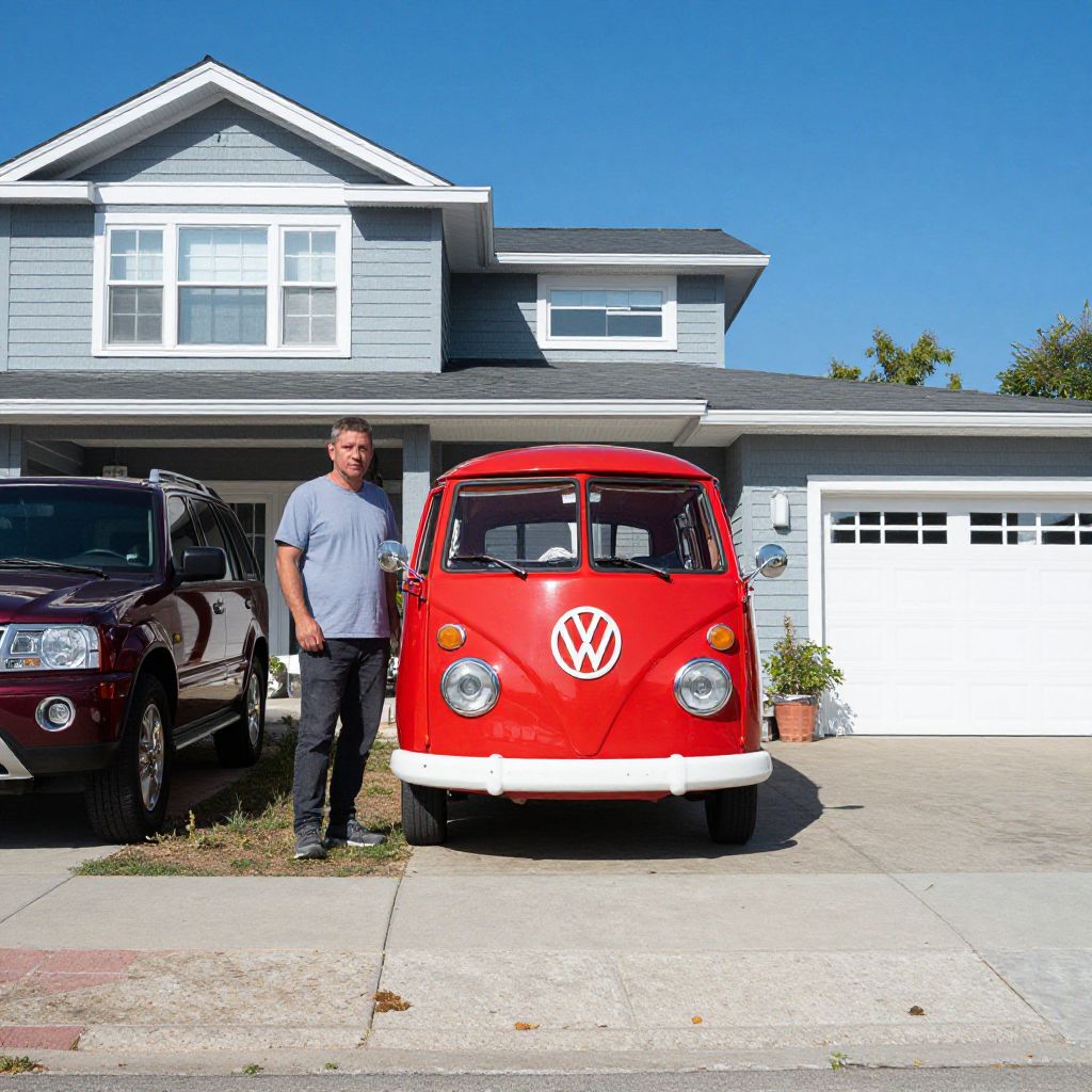 Vibrant red Volkswagen SP2 parked prominently in front of a suburban home, with a man standing beside it and a maroon SUV positioned nearby under a clear blue sky.