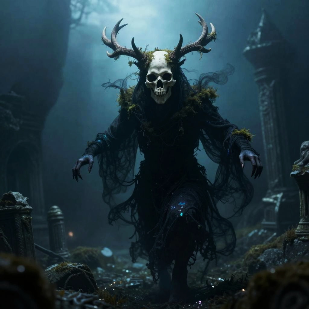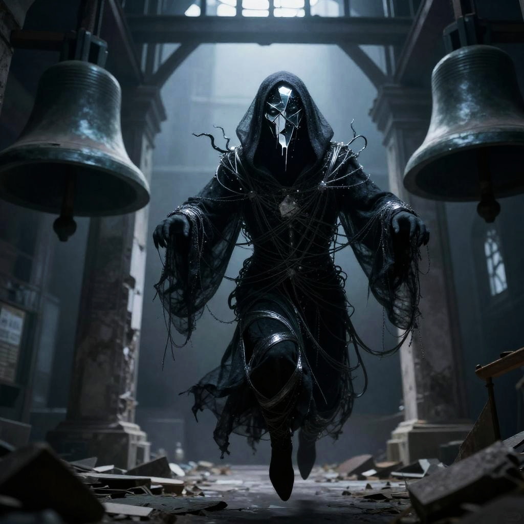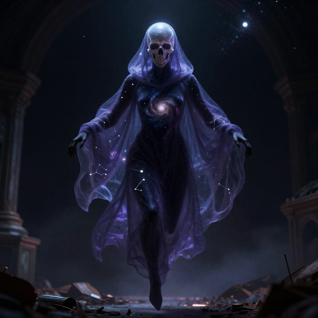 A sinister wraith with a cracked porcelain mask with trailing dark veins, wrapped in moth-eaten pewter shrouds, gliding silently through a abandoned opera house balcony.