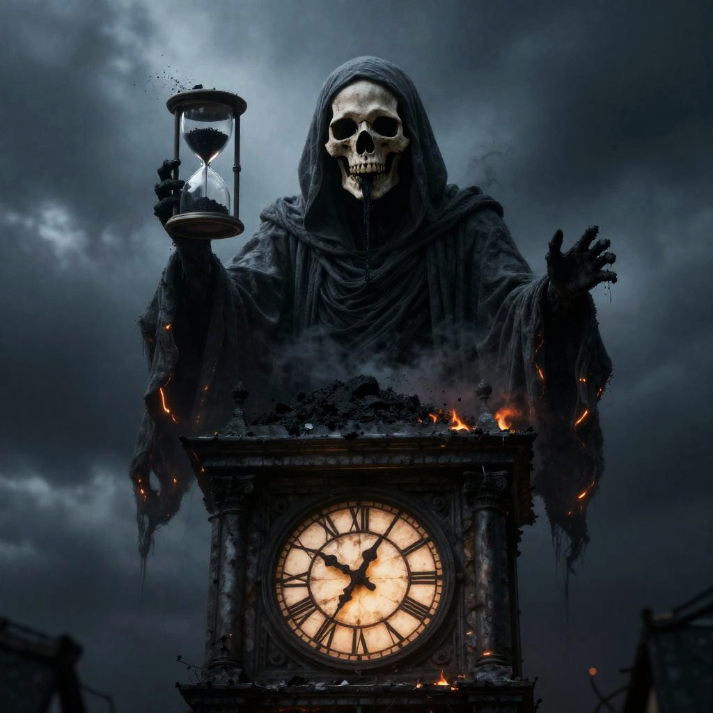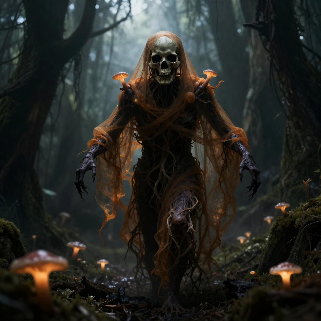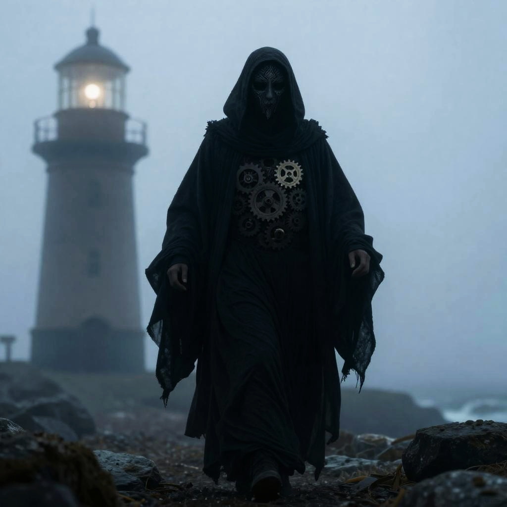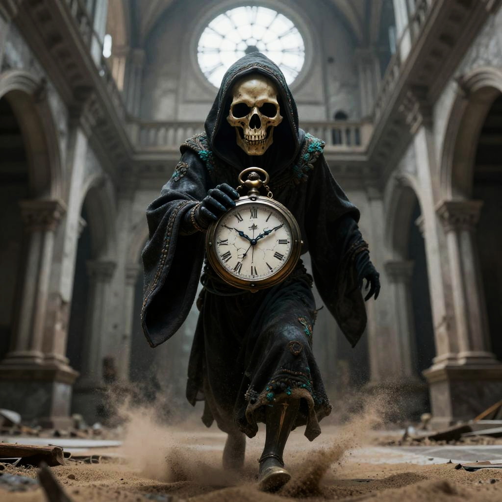 A sinister wraith with a cracked porcelain mask with trailing dark veins, wrapped in moth-eaten pewter shrouds, gliding silently through a abandoned opera house balcony.