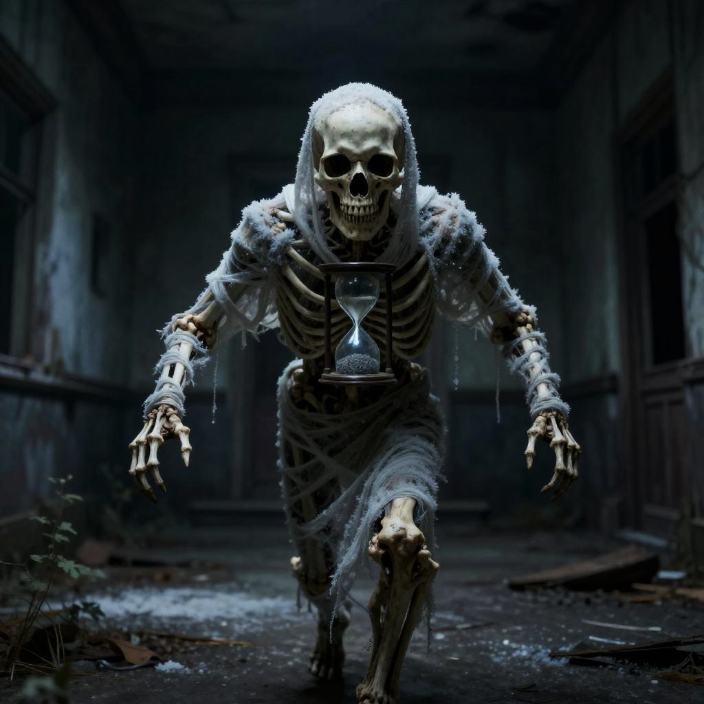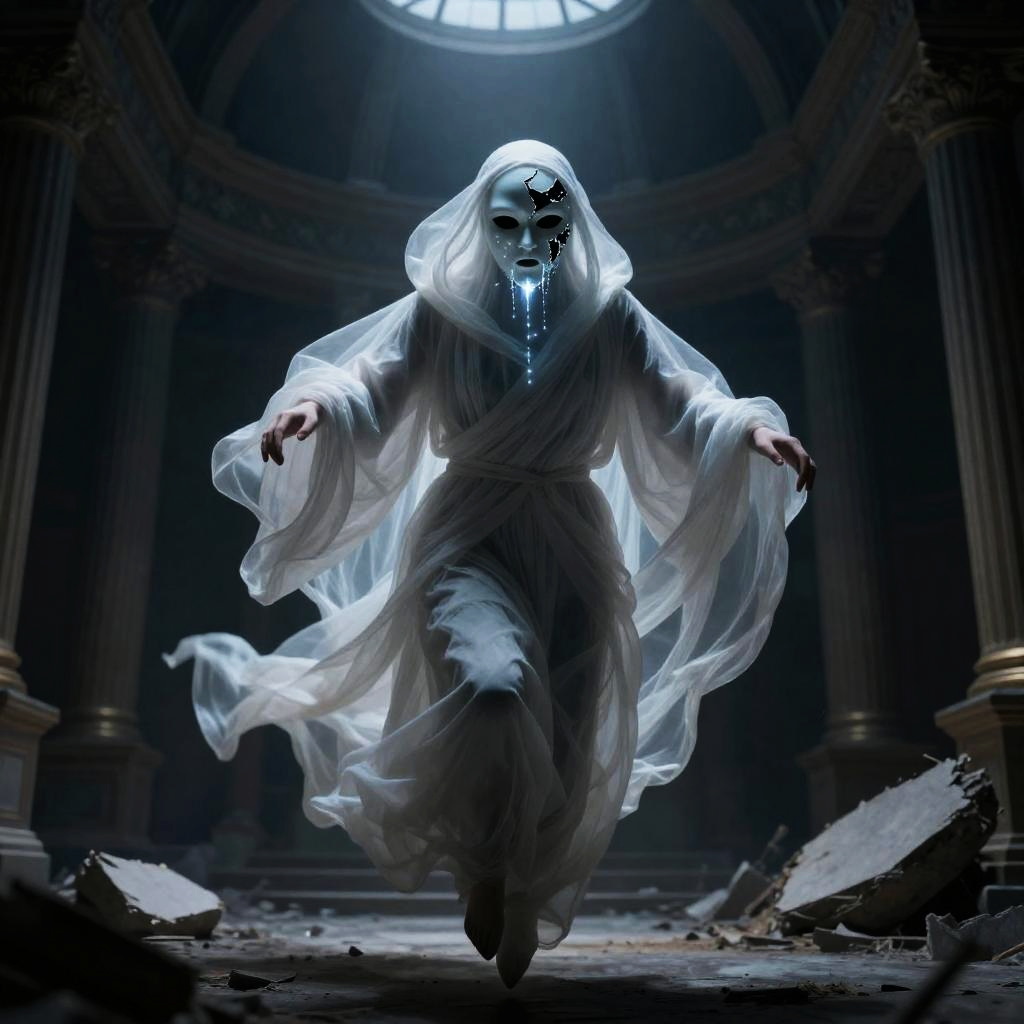 Sinister Wraith with Cracked Porcelain Mask in Abandoned Opera House
