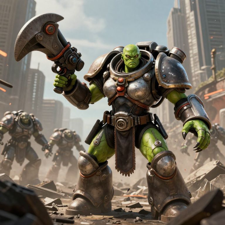 40k female ork warboss leading a horde through a shattered cityscape, massive power claw and shotgun in hand, menacing expression, vivid green skin, post-apocalyptic sci-fi setting