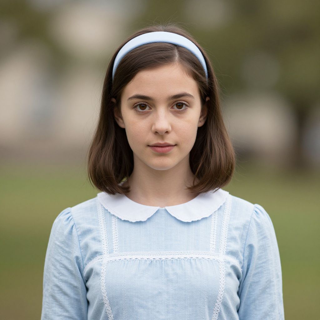Anne frank fancy dress, 1girl, solo, blurry background, blurry, realistic, outdoors, hairband, looking at viewer, brown hair, upper body, dress