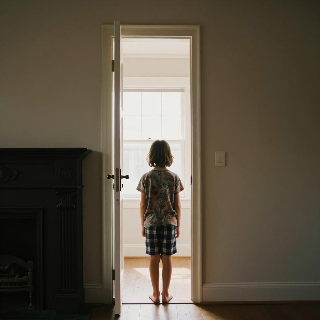 Child with short brown hair, wearing a patterned shirt and plaid shorts, stands in doorway, facing bright light. Dimly lit room with ured walls, black fireplace to left. Door open, light spills in. Child's back to viewer.