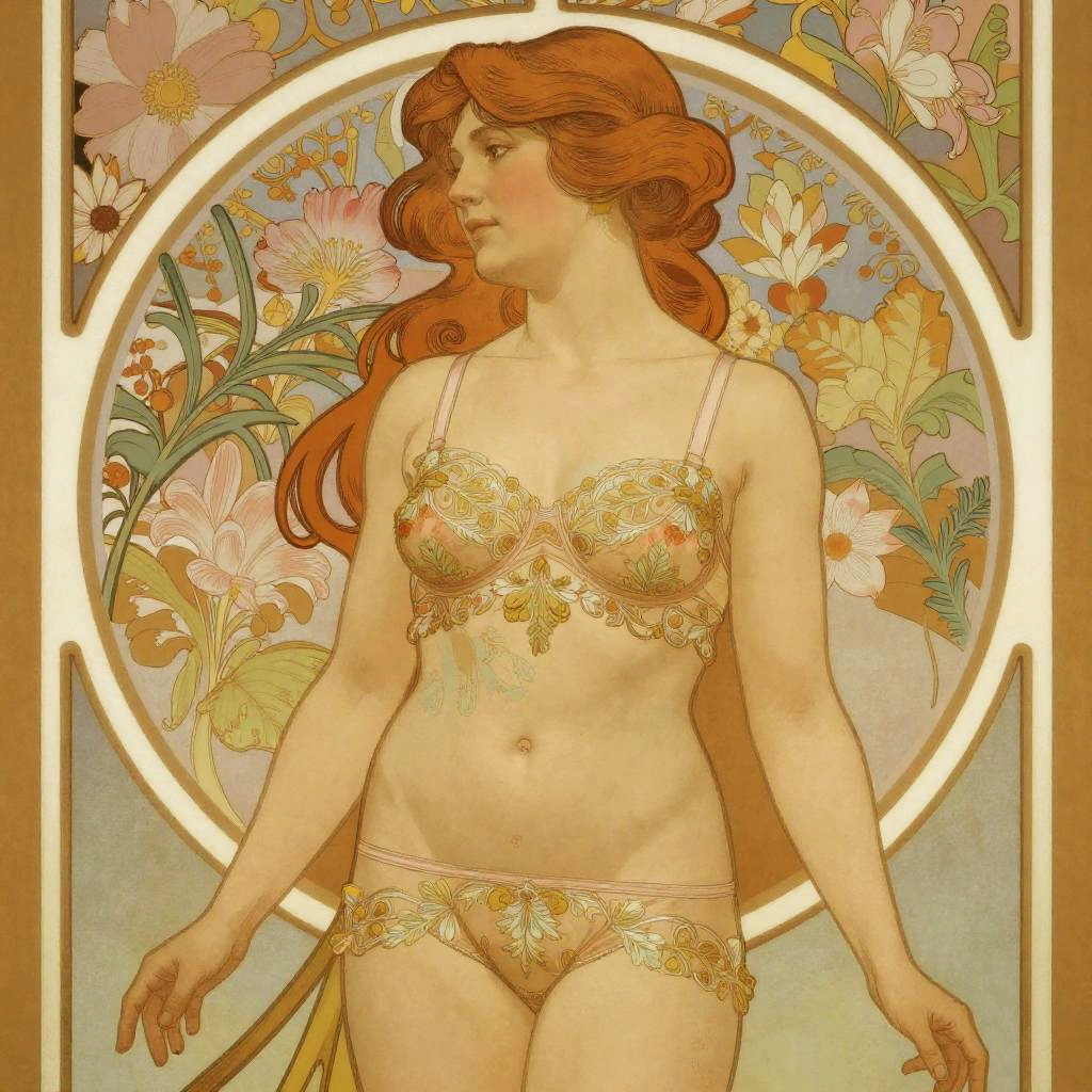 Image in the style of Impressionism, adorable young boy, curly short hair, small and playful build, lingerie bralettes, bright colorful pajama top and shorts, scenic park setting studio background