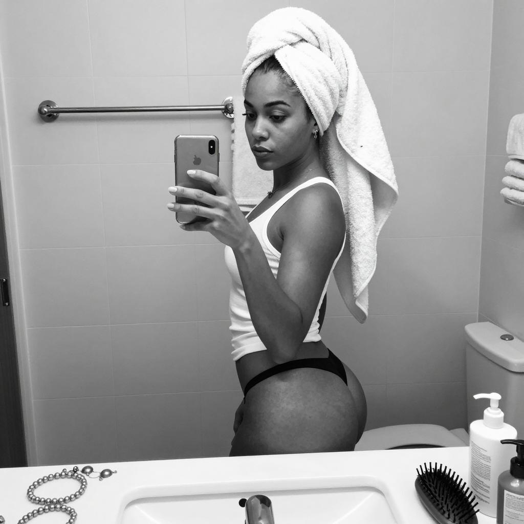 African American woman with dark skin, curly black hair in a high bun with a red hair tie, wearing a black halter bikini top, leaning forward with tongue out. Sunlight illuminates her face and upper body. Indoor setting with white door and door handle in the background.