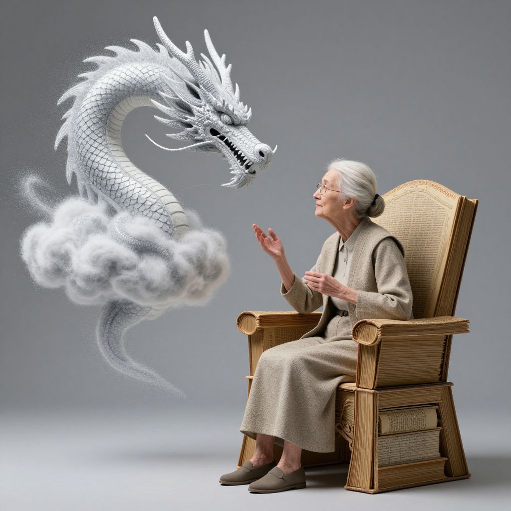 Elderly woman seated on a throne crafted from hollow books, engaging in a serene dialogue with a majestic dragon-shaped cloud composed of sentient dust, its form whispering ancient wisdom in the voices of forgotten poets.