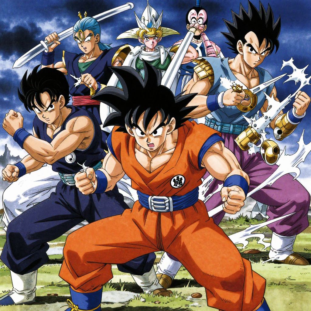 Digital artwork of Dragon Ball Z characters, including Goku in orange, Vegeta in blue, and others, posing powerfully with lightning effects.