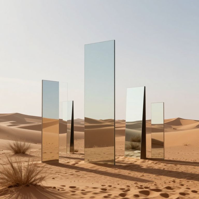 In a surreal desert oasis, towering mirrors stand like sentinels, their reflective surfaces whispering echoes of infinite possibilities, inviting introspection and the quiet hope of what might be.