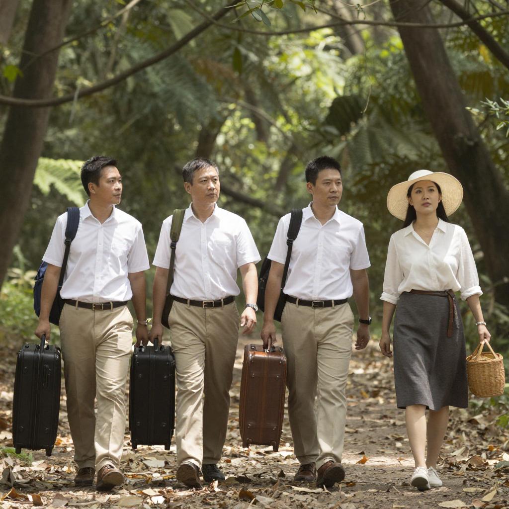 Photograph of four people walking through a forest. Three men in white shirts and khaki pants, one woman in a white blouse, gray skirt, and large sunhat. Each carries a suitcase. Woman in front right holds a basket. Sunlight filters through trees. People in mid-stride, looking ahead. Background filled with green foliage and tree trunks.