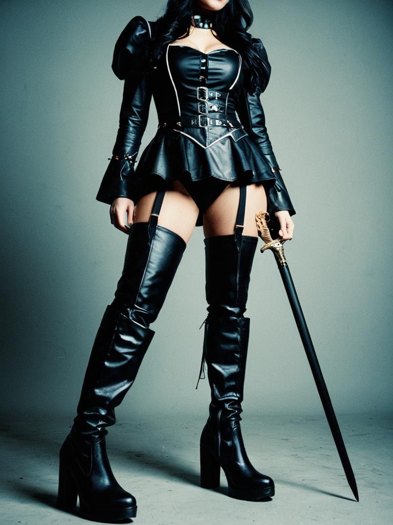 Woman in Thigh High Boots Outfit costume, cosplay editorial photography, realistic tones
