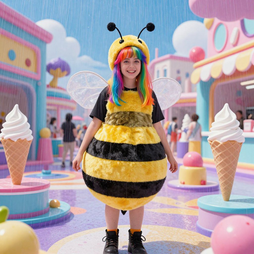 Photograph of a young girl with rainbow hair, dressed in a yellow and black bee costume with wings, standing in a colorful, whimsical amusement park setting. The costume includes a furry bodysuit, black bee stripes, and a yellow hat with black antennae. She wears black shoes and smiles at the camera. The background features pastel-colored buildings, an ice cream cone, and swirling white whipped cream, all under a blue sky with rain. The scene is vibrant and playful, with soft textures and bright, cheerful colors.