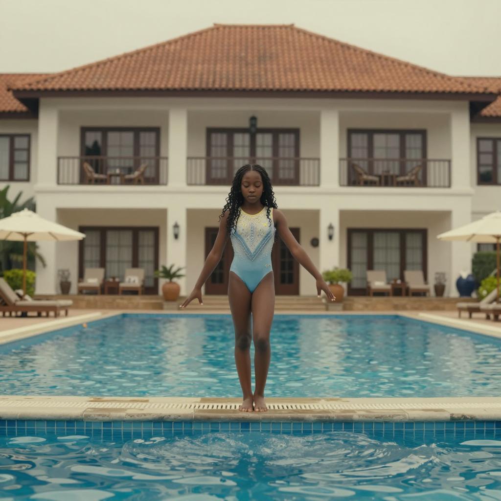 Spanish Art A 15 year old Black girl, gymnast, in a Wes Anderson film, adventurer, long hair, living in a hotel in Lake Volta, Ghana, walking on water, in a hotel pool, 16:9 aspect ratio, wide lens, head to toe image v,