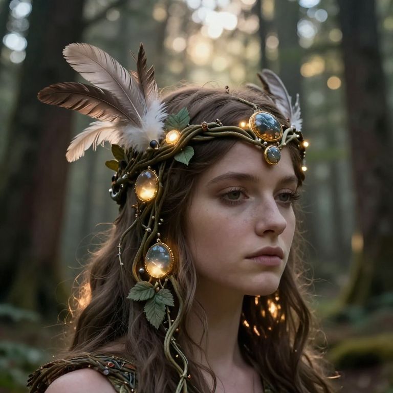 Intricate druid headpiece featuring intertwined vines and leaves, embedded with polished stones and feathers, glowing softly with magical energy, set against a dawn-lit forest background with ethereal light filtering through tall ancient trees.