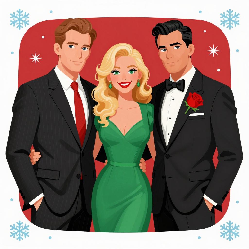 Illustration of three people standing closely together. A blonde woman with curled hair, green dress, and smile is centered. Two men with slicked-back hair wear black suits, one with pinstripes and red tie, the other with black bow tie and red rose. Snowflake border on white background. Red background behind them. Man on left has arms crossed, men on right look to the left.