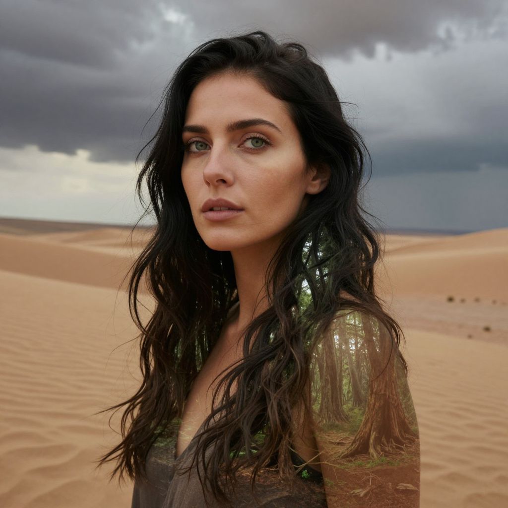 Craft an evocative double exposure portrait of a woman in her mid-thirties with cascading dark hair and piercing green eyes, exuding serenity yet veiled mystery. Positioned at the edge of a vast desert beneath turbulent skies, the secondary image of a dense ancient forest is subtly revealed through her translucent skin. The intricate patterns of the forest intertwine harmoniously with her features, creating an enigmatic visual symphony that captures nature's resilience and human existence's fleeting beauty. Each curve of the rugged desert terrain mirrors the depth of her expression, showcasing both nature's strength and life's transience in a graceful dance of light and shadow.