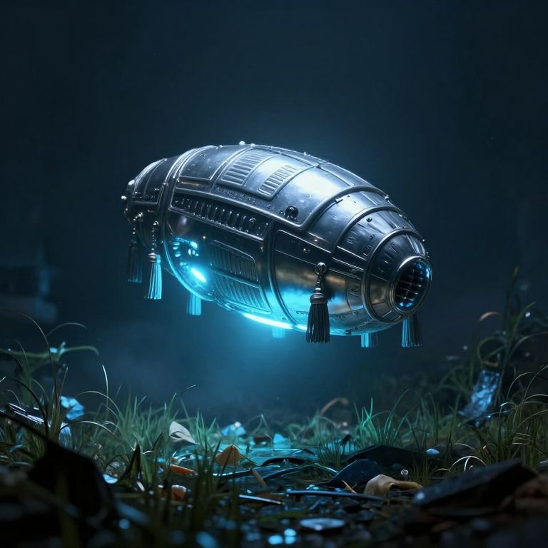Tassels oblong metallic alien craft emits a hazy blue glow and hovers close to the ground, surrounded by overgrown grass and garbage, cinematic, chairoscuro lighting, ominous,