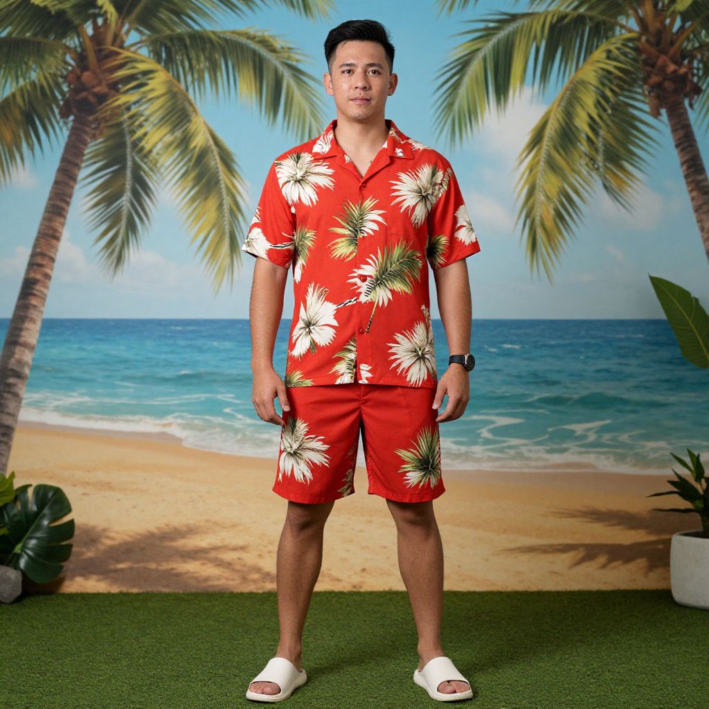 Photograph of a young Asian man standing on green artificial turf, wearing a bright red Hawaiian shirt with white and yellow floral patterns, and matching red shorts. He has short, black hair and a medium build. He is also wearing white slip-on sandals and a black wristwatch on his left wrist. The background features a tropical beach scene with clear blue ocean, golden sand, and large palm trees with green fronds, set against a bright blue sky. The image is well-lit with natural colors and a clear focus on the subject.