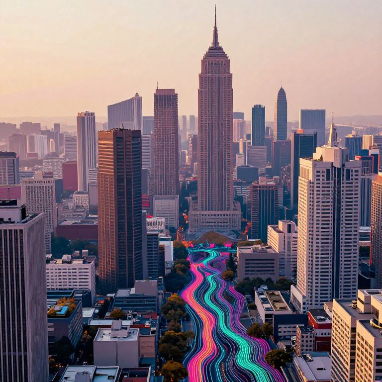 Artistic representation of a ControlNet depth map, blending realistic urban cityscape with stylized depth layering, highlighting elevation changes with vivid color gradients, abstract data streams weaving through terrain, cyberpunk aesthetic with soft lighting effects.