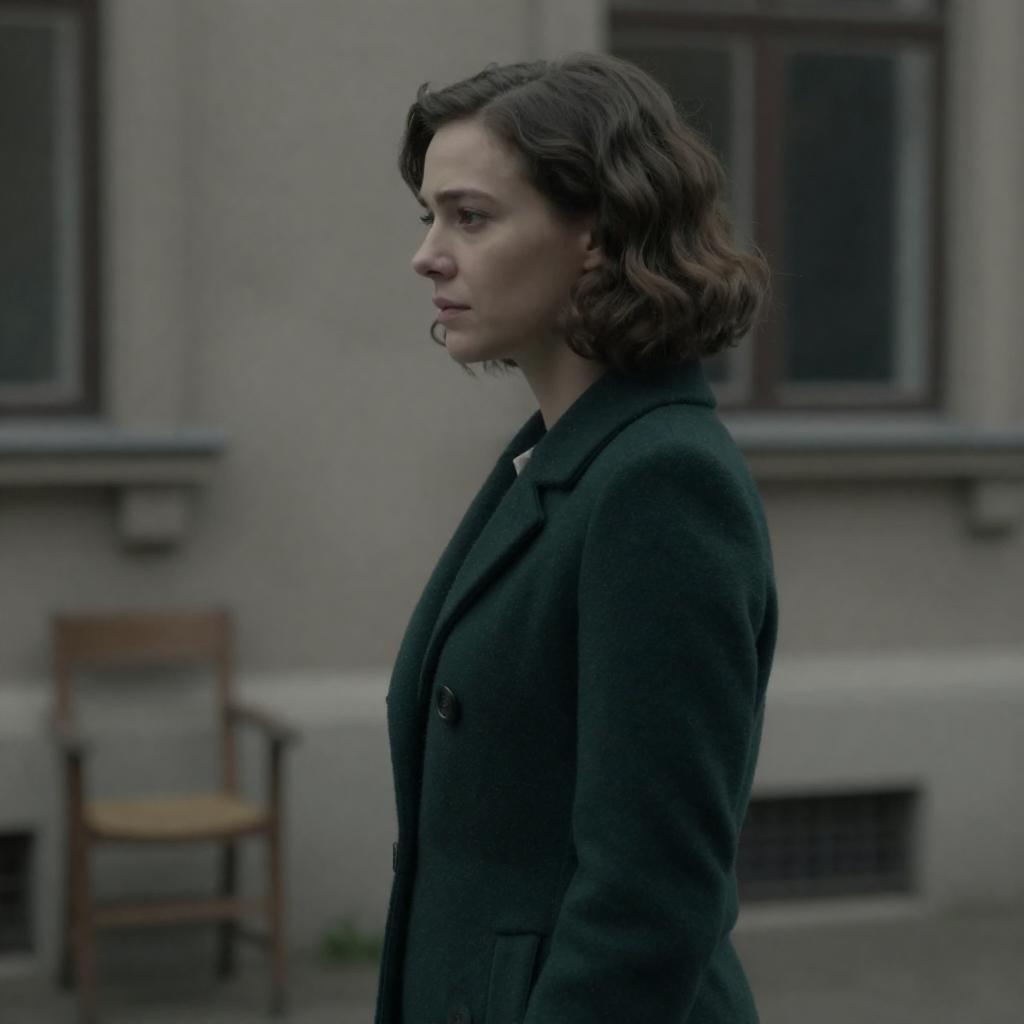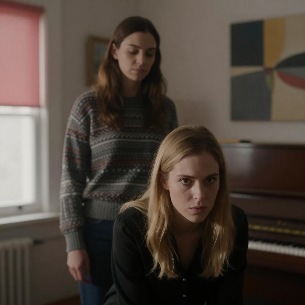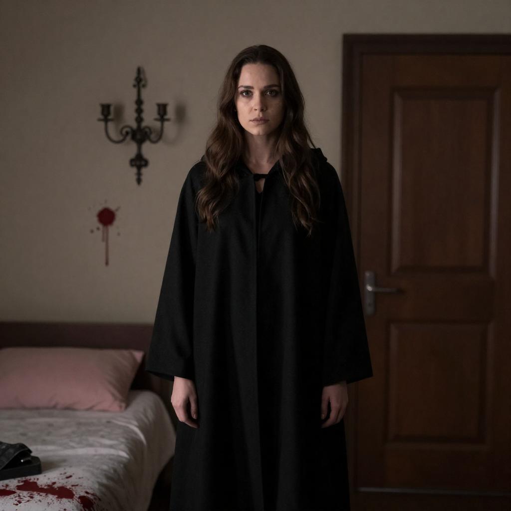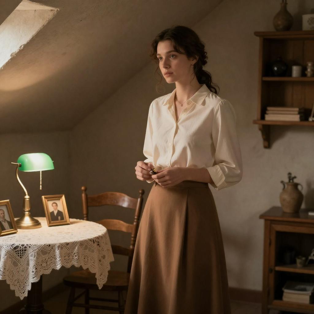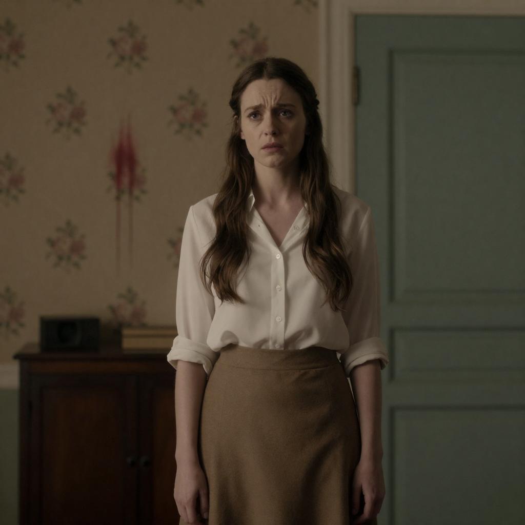 Photograph of a woman with long brown hair, pale skin, wearing a white blouse and brown skirt, standing in a dimly lit room. She has a worried expression. Background includes floral wallpaper, a dark wooden cabinet, and a partially open green door. Red streaks on the wallpaper.
