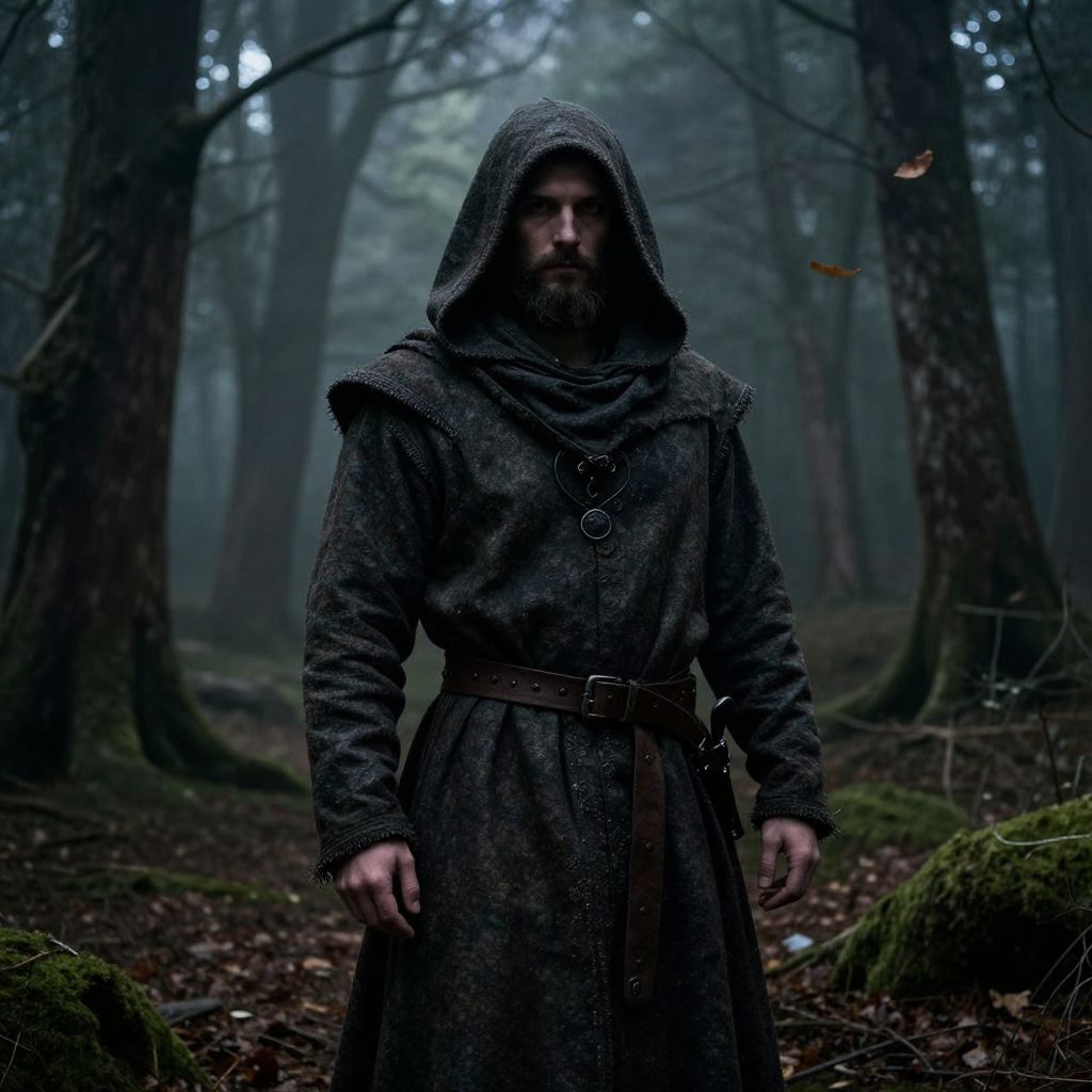 Photograph of a bearded man in a dark, hooded, medieval-style robe with a belt, standing in a misty, dark forest.