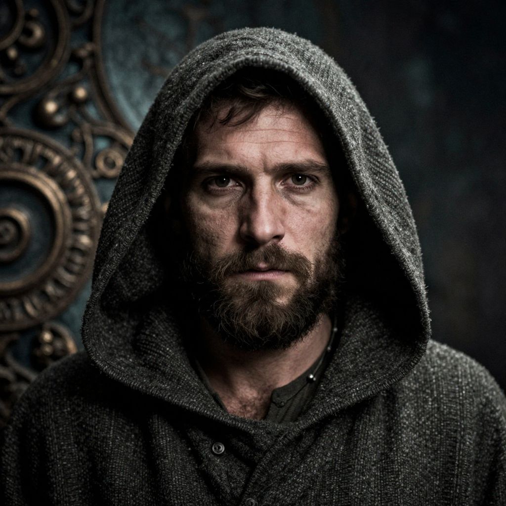 A man with a beard and mustache is wearing a medieval costume with a hood and a scarf around his neck. He is standing in a dark forest with tall trees and a foggy atmosphere. The lighting is dim, creating a mysterious and eerie mood. The man's clothing is made of dark, weathered fabrics, and his face is partially obscured by the hood. The scene is rich in detail, with the forest floor covered in moss and fallen leaves, and the air filled with the sounds of rustling leaves and distant wildlife. The overall atmosphere is medieval and enchanting, evoking a sense of adventure and mystery.
