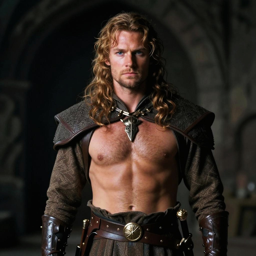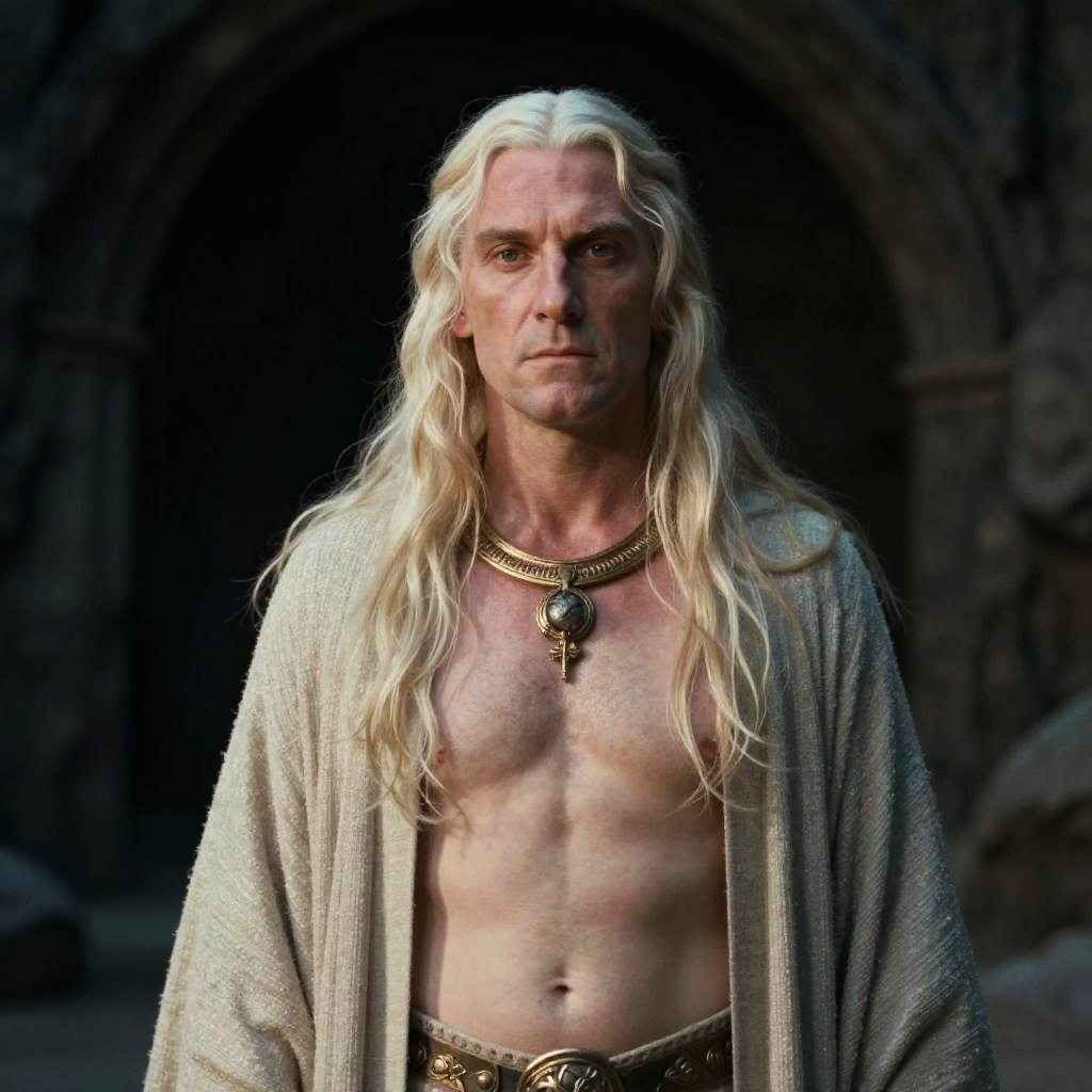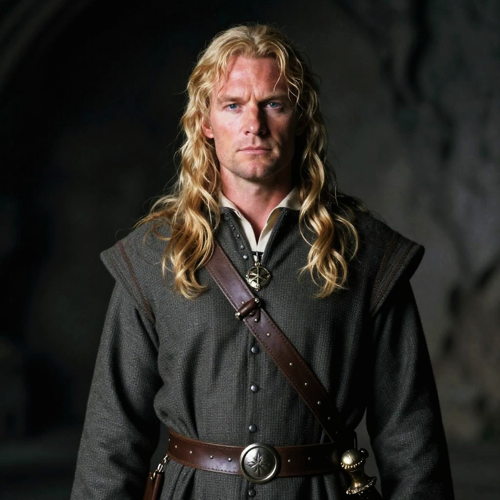 Portrait of a radiant Silvan elf maiden with long blonde hair and pointed elf ears. She wears a white and gold fantasy-inspired top with a crisscross design, exposing her torso and abdomen. The image captures her clear complexion and natural beauty, set against a dark, mystical background reminiscent of Lord of the Rings style.