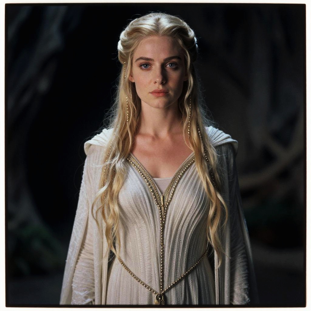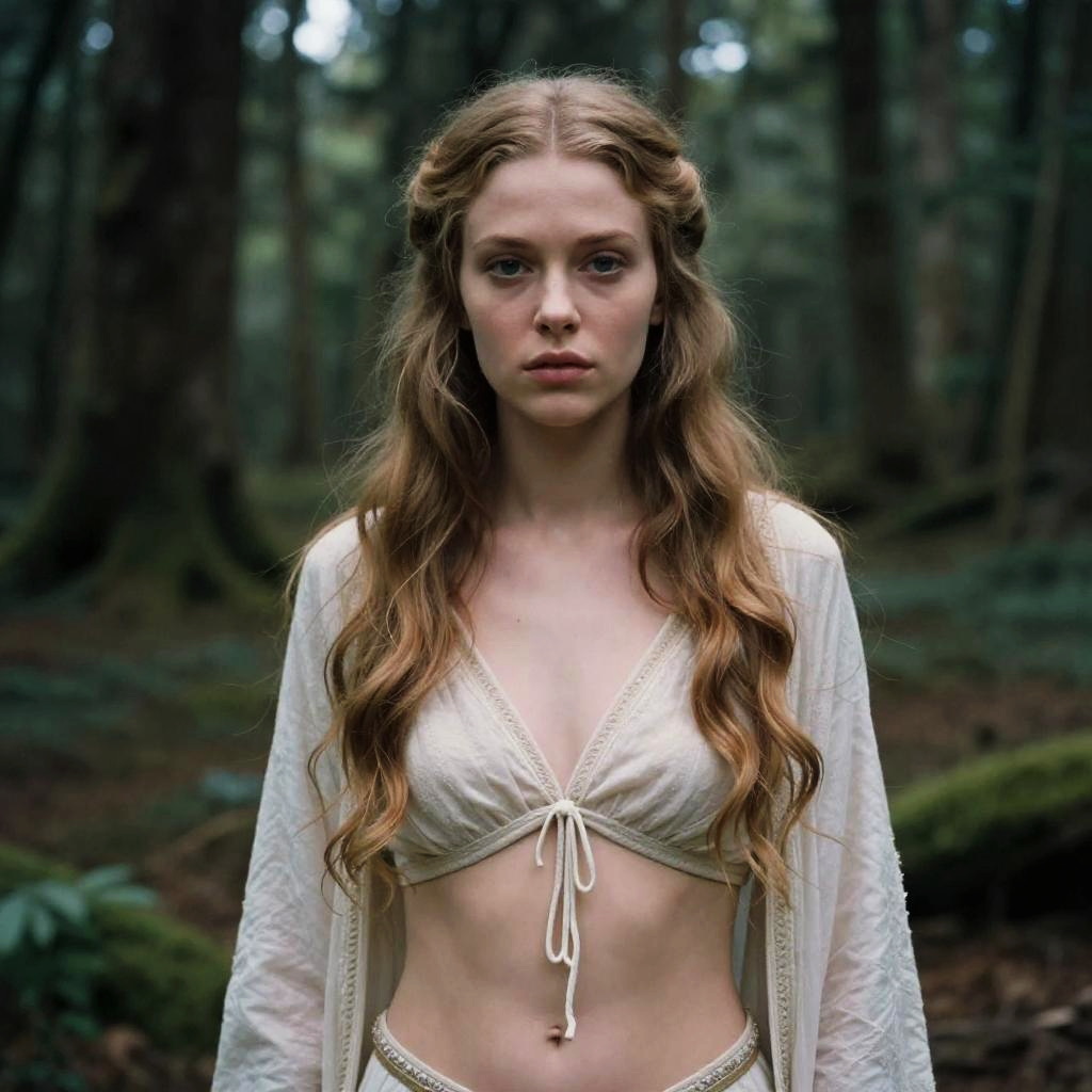Portrait of a radiant Silvan elf maiden, in a Lord of the Rings setup. Shot on Portra 400 film, the image highlights a full torso and abdomen, emphasizing a clear complexion, natural beauty, and mystic style.