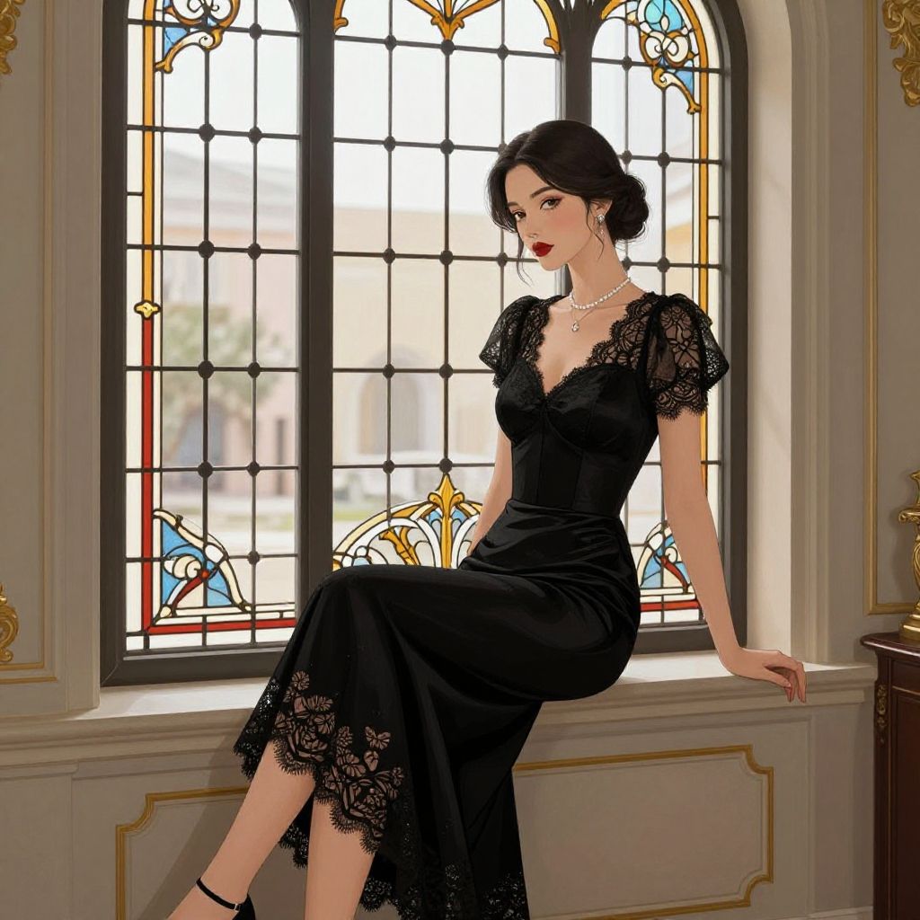 Digital illustration of a fair-skinned woman with dark, wavy hair styled in an elegant updo. She wears a black, lace-trimmed, short-sleeved dress with a deep V-neck, accentuating her slender frame and moderate breast size. She sits gracefully on a window sill, leaning slightly to one side, with her right hand resting on the sill and her left arm relaxed. She accessorizes with a pearl necklace and red lipstick. The background features a large, ornate stained glass window with geometric patterns, casting a soft, colorful light into the room. The walls are decorated with gold accents, adding a touch of opulence.