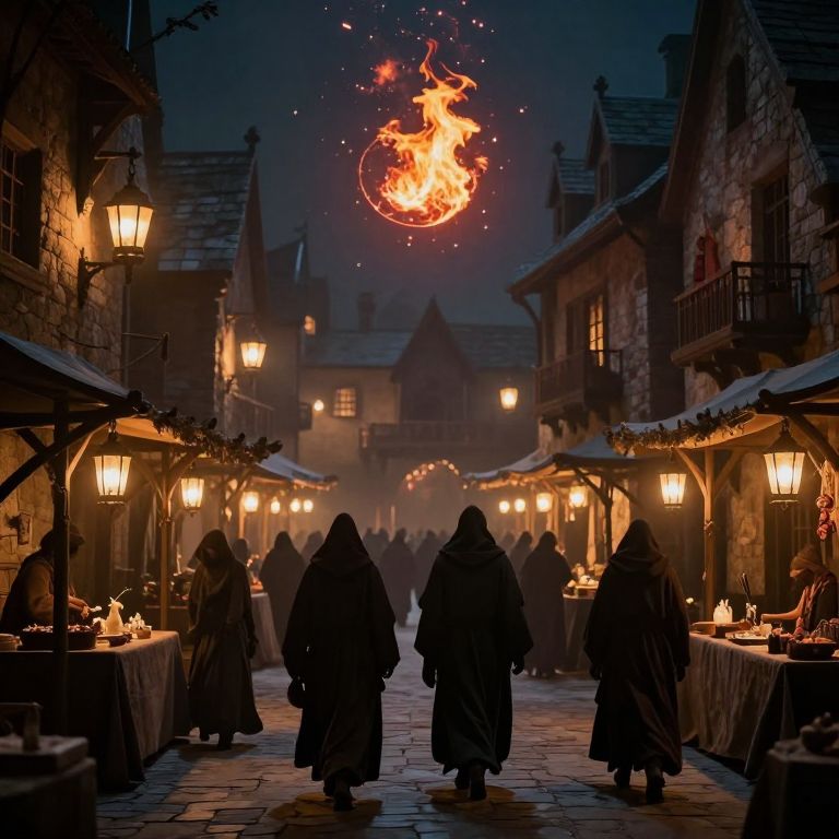 Cloaked figures navigate a dimly lit medieval marketplace, flanked by stone buildings and illuminated by warm lanterns, as fiery, floating orbs hover above, casting an otherworldly glow over the scene.