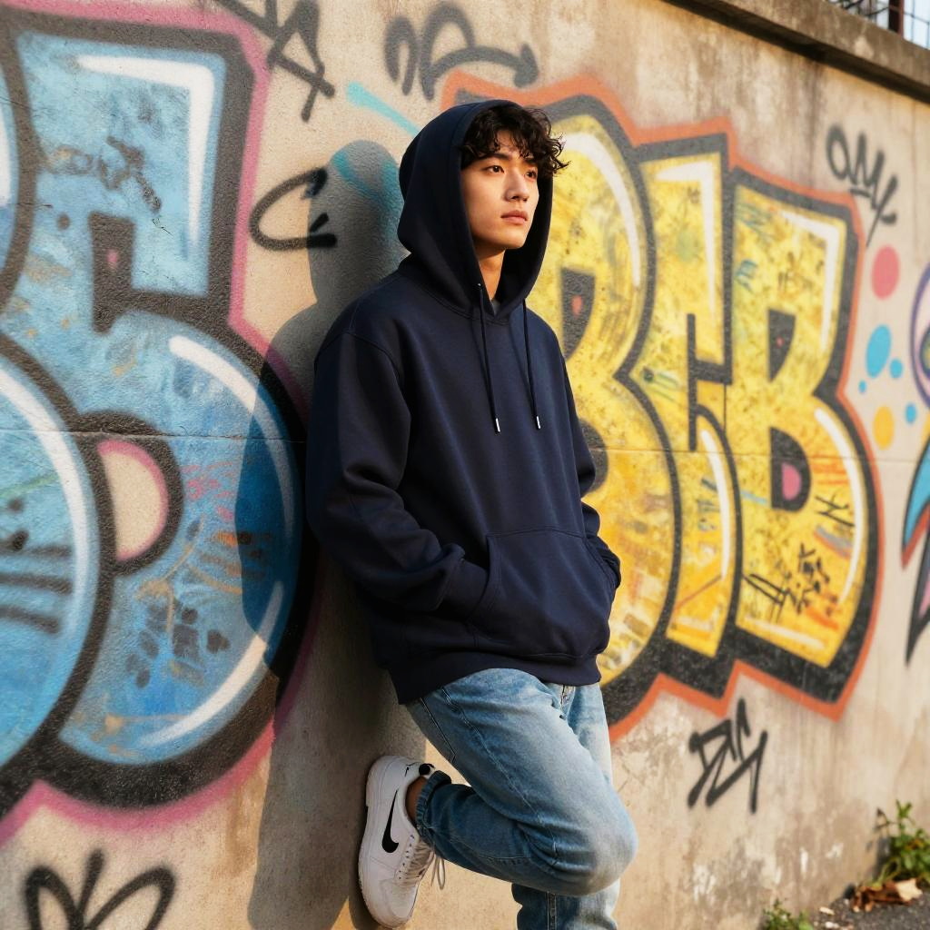 Character wearing hoodie leaning against graffiti-covered wall, casual pose, bright street art background, warm golden hour lighting, urban street style portrait