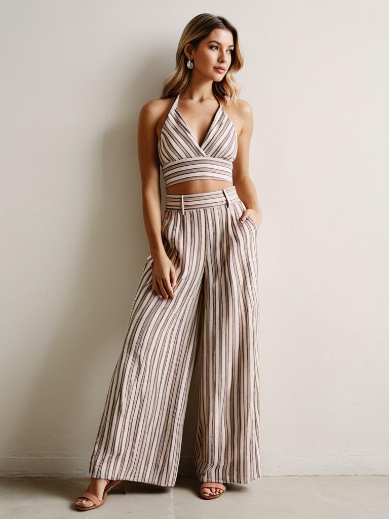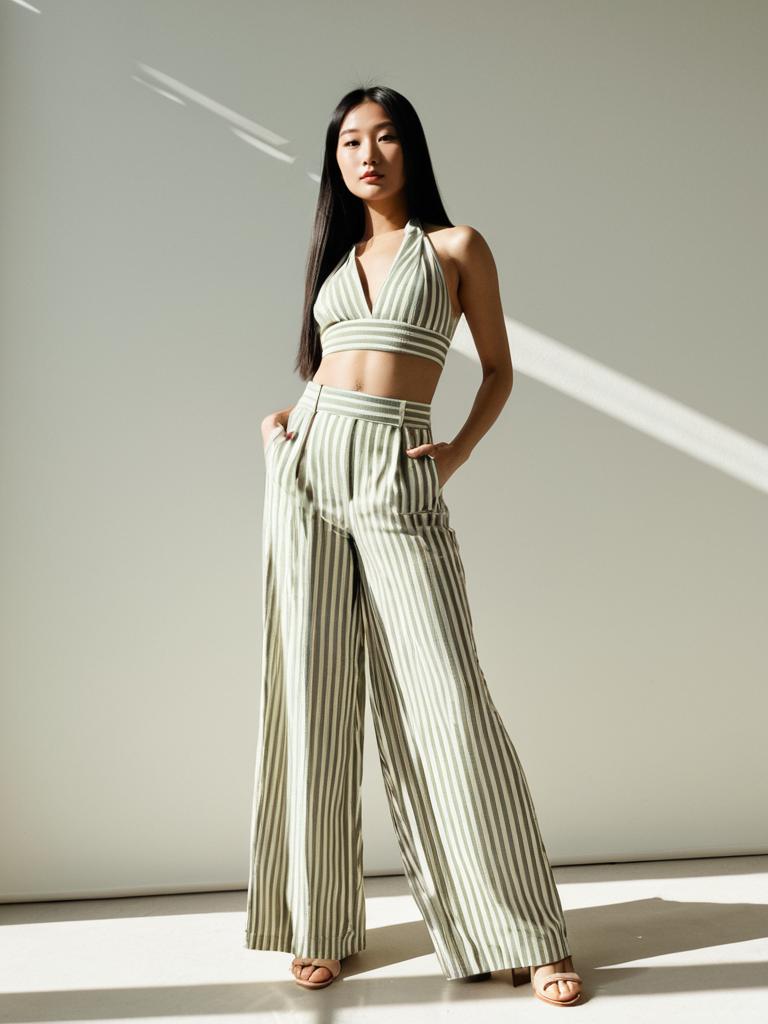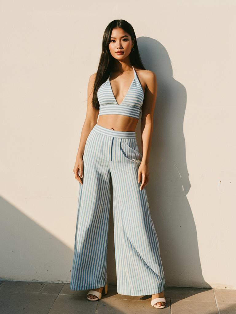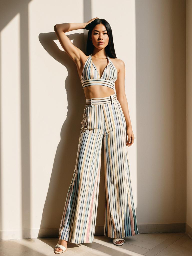 Asian woman with sleek straight hair wearing a matching striped two-piece outfit consisting of a deep V halter crop top with wide waistband and high-waisted wide-leg palazzo pants. The set features a vanilla base with pastel rainbow vertical stripes. Posed standing against a light sandstone-colored wall with natural front-side light creating soft shadows, showcasing modern Parisian-inspired fashion.
