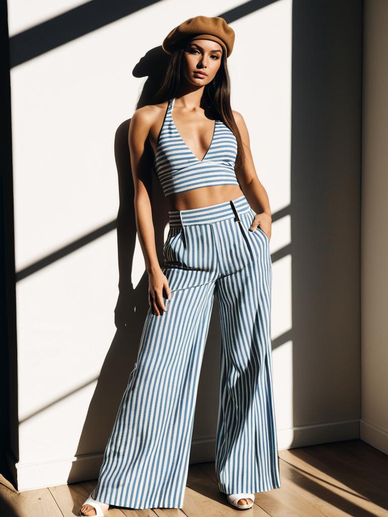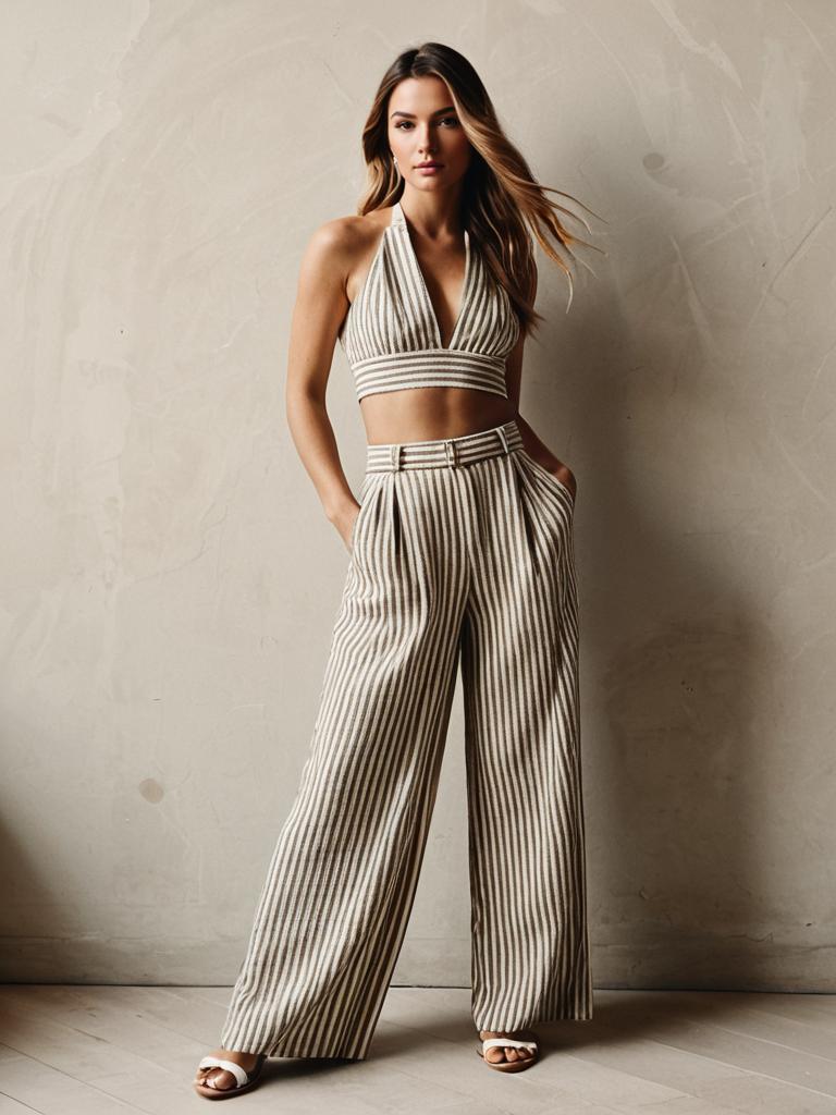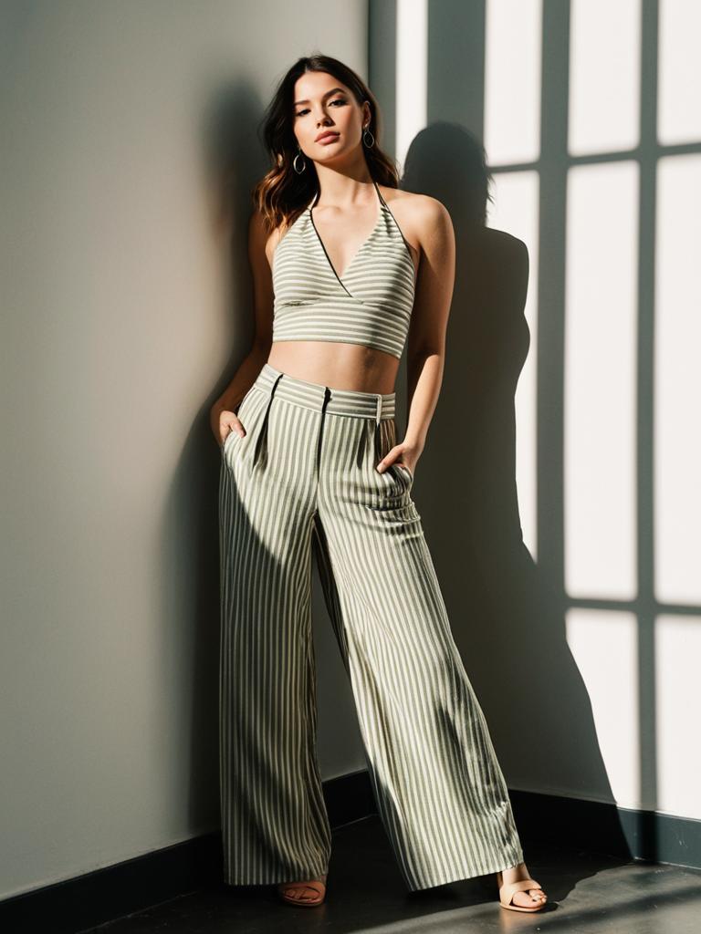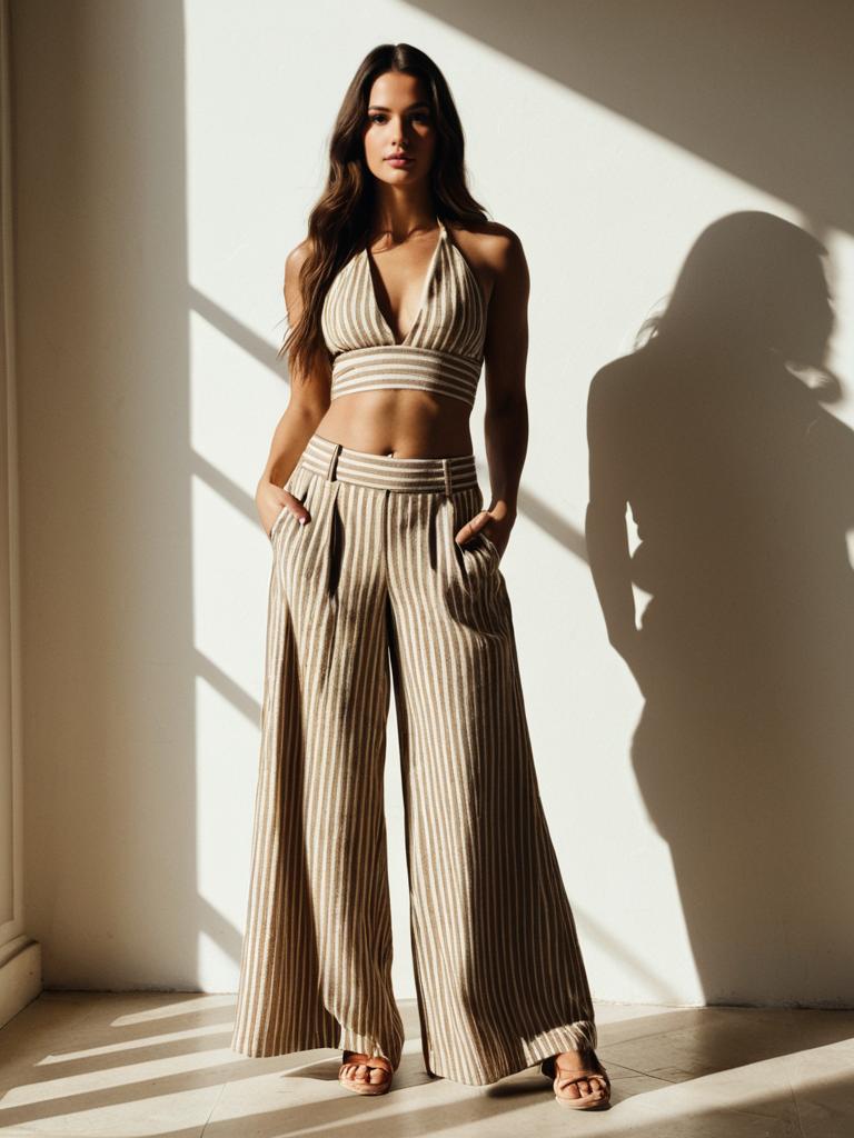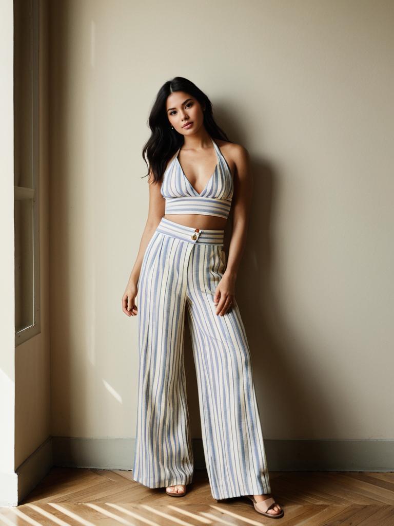 Asian woman with sleek straight hair wearing a matching striped two-piece outfit consisting of a deep V halter crop top with wide waistband and high-waisted wide-leg palazzo pants. The set features a vanilla base with pastel rainbow vertical stripes. Posed standing against a light sandstone-colored wall with natural front-side light creating soft shadows, showcasing modern Parisian-inspired fashion.
