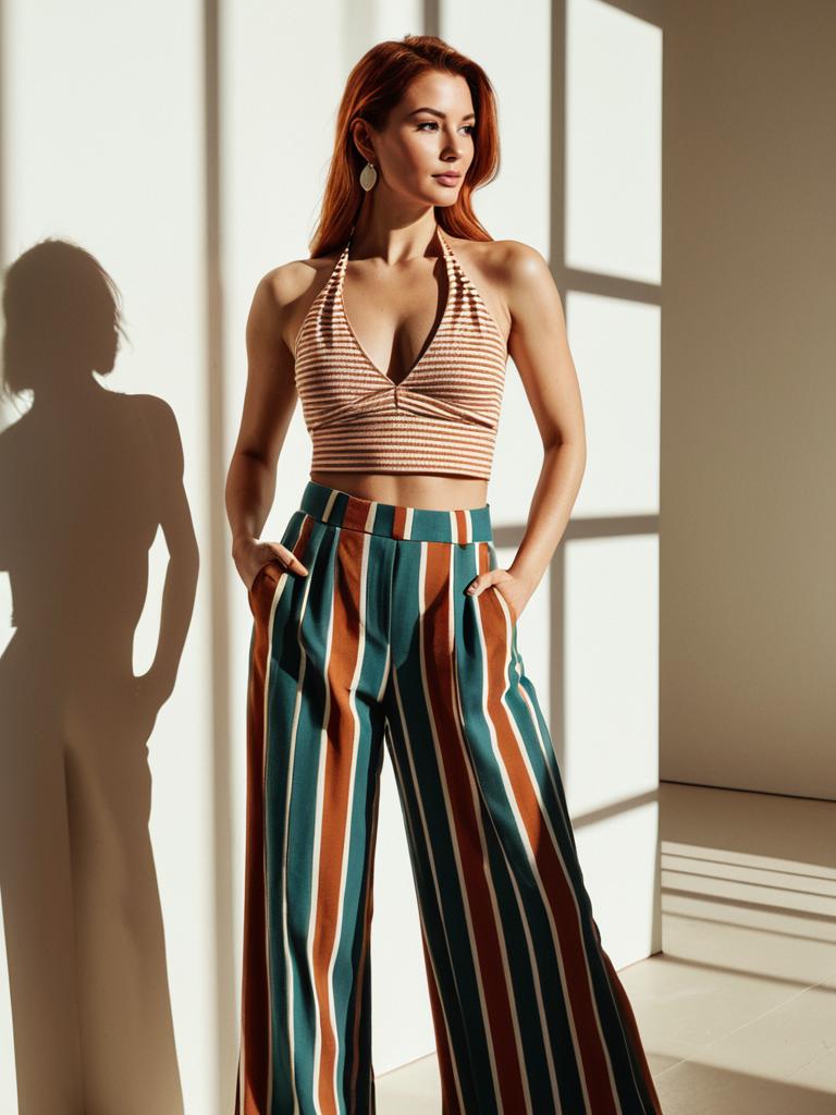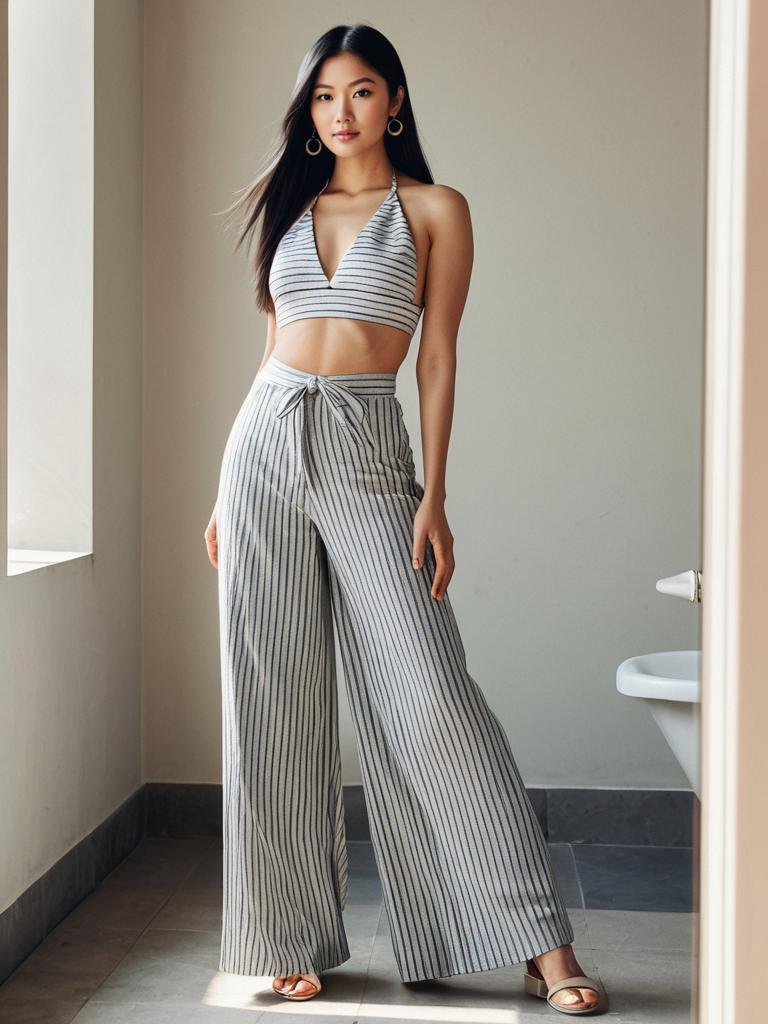 Woman wearing striped two-piece set with deep V halter crop top, wide waistband and high-waisted wide-leg palazzo pants in vanilla base with pastel rainbow stripes on Asian woman with sleek straight hair and natural glow posed standing with both hands behind her back, gentle tilt of head in light sandstone-colored wall with high windows casting light under front-side natural light with mild shadow on wall, modern Parisian-inspired fashion photography, high resolution, ultra-detailed